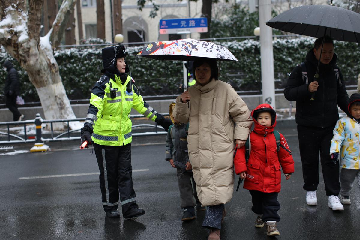 A traffic police officer guards a school during Tuesday morning's rush hour in Wuhan. [Photo provided to chinadaily.com.cn]