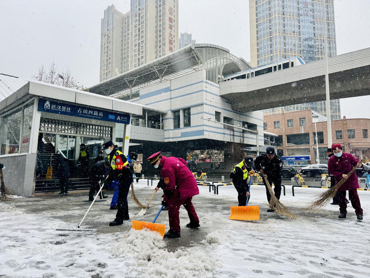 Police and subway staff clear snow in Wuhan. [Photo provided to chinadaily.com.cn]