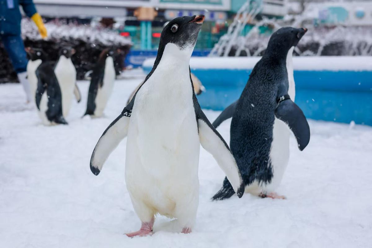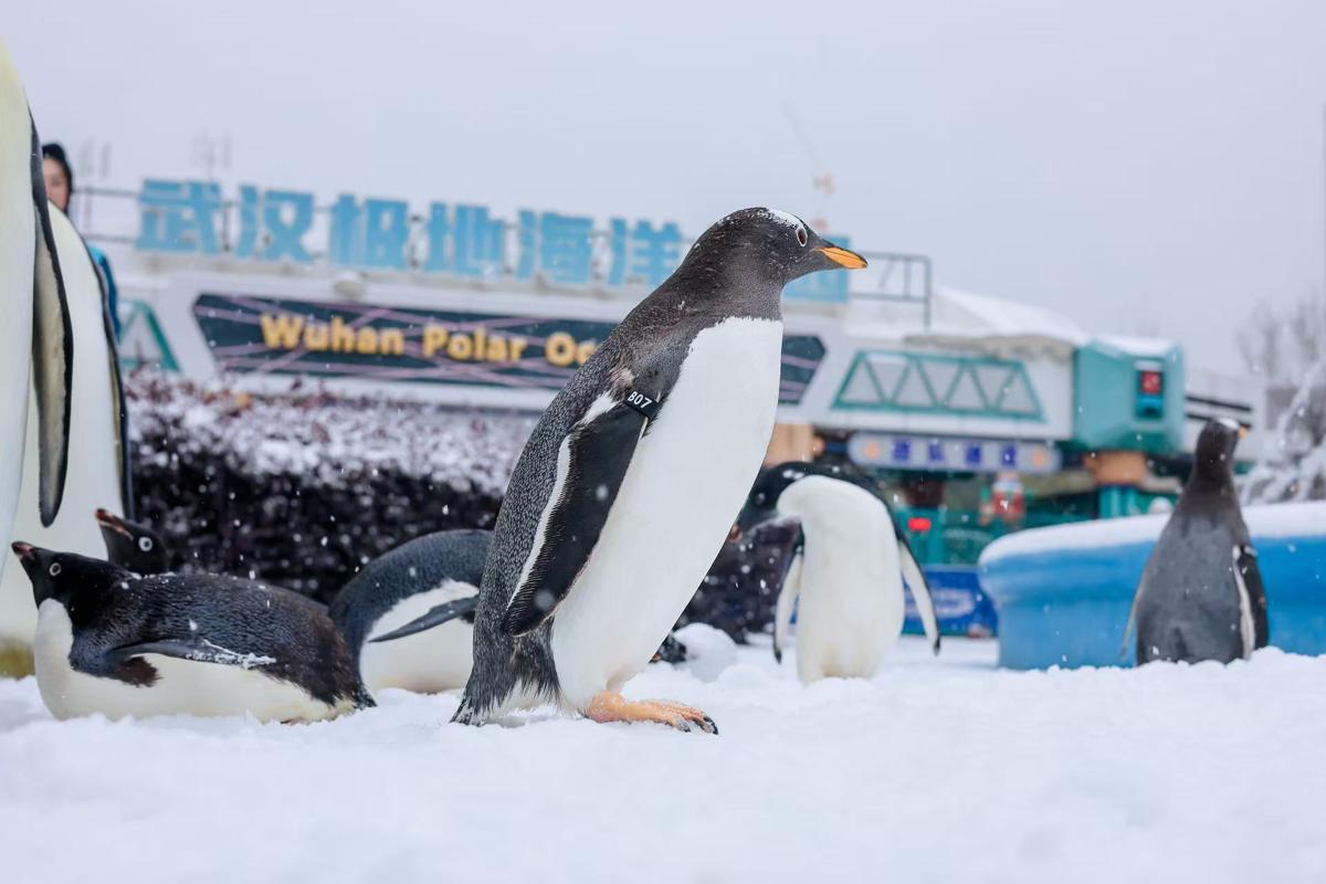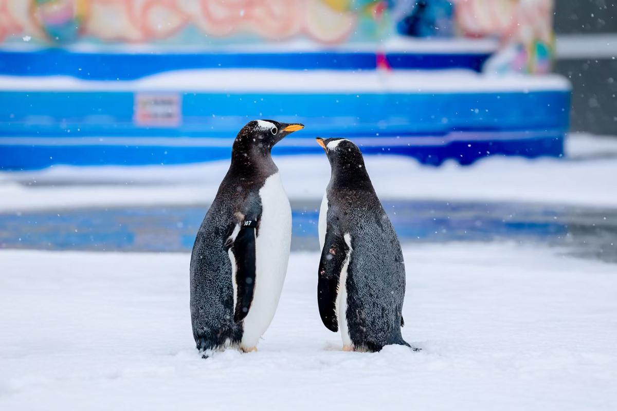 Penguins play in the snow on Tuesday at Wuhan Polar Ocean Park in Hubei province. [Photo provided to chinadaily.com.cn]