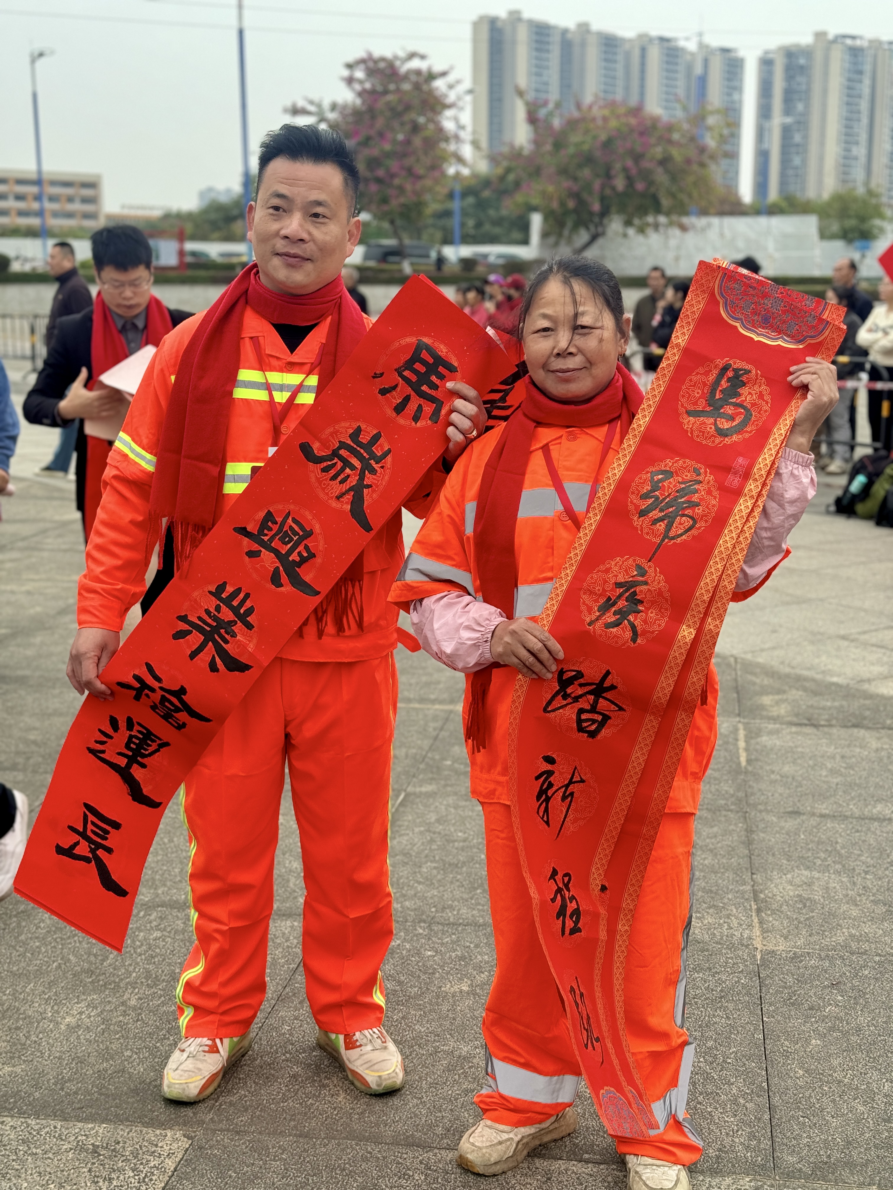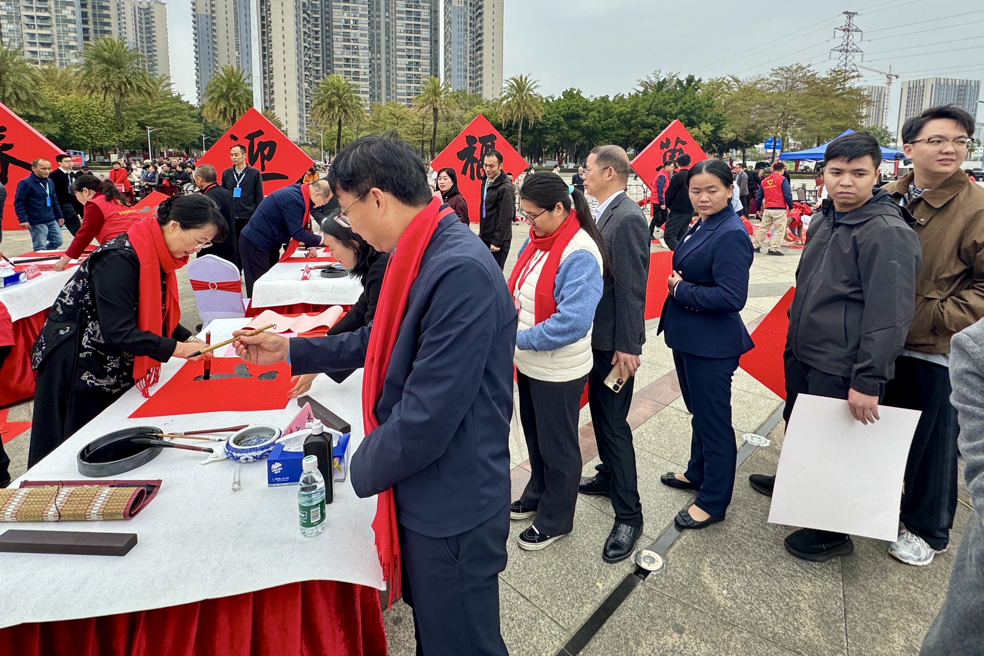 活動現場滿掛着紅彤彤的揮春,營造出喜慶祥和的節日氛圍。剛勁南獅與靈動舞龍碰撞着鏗鏘鼓點,婉轉唱腔與嶺南器樂融合着韻律說唱,一段極具嶺南文化特色的演出之後,中國書法家協會主席孫曉雲領銜開筆,書寫「福」字。參與活動的海內外書法家隨後一齊動筆,為現場的各行業代表及市民大眾寫揮春並送祝福。當天適逢大寒節氣,寒冷的天氣也阻擋不住大家的熱情,活動吸引了大量市民趕來,他們圍着欣賞書法名家行筆弄墨,領取「福」字與揮春的人群排成了長龍。