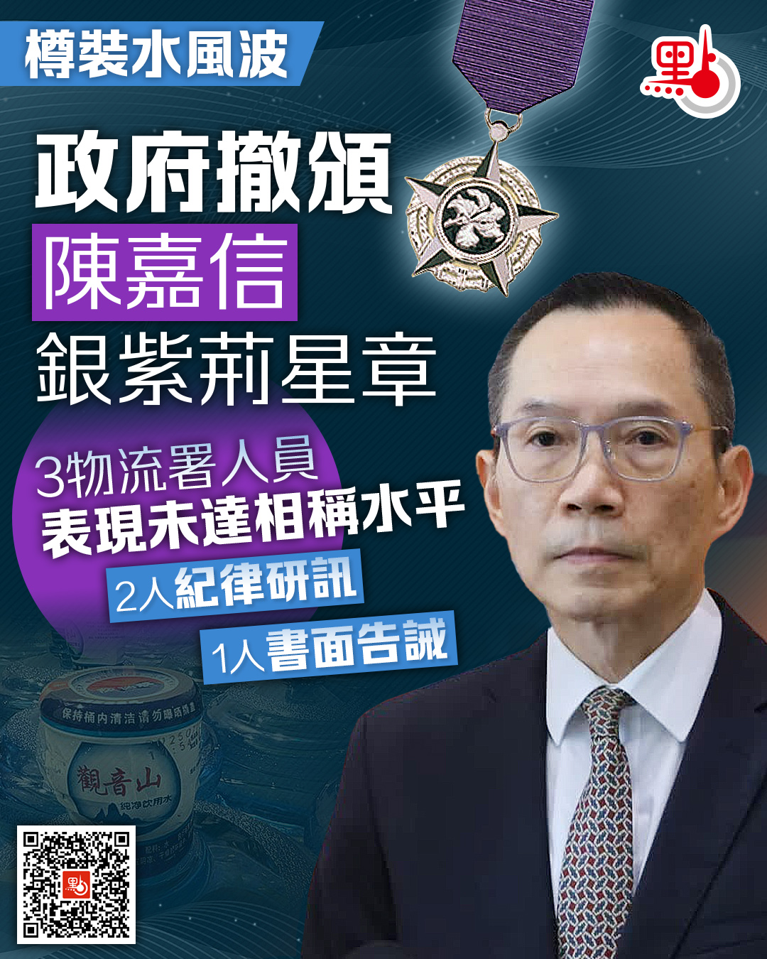大公文匯全媒體報道,政府採購樽裝水早前揭「冒牌水」風波,紀律調查裁定3名物流署人員失職被問責,消息指包括前採購總監曾昭奇。政府亦決定撤回早前公布向時任物流署署長陳嘉信頒授銀紫荊星章的決定。據了解,陳嘉信不打算上訴。公務員事務局回覆傳媒查詢時,確認陳嘉信享退休金,如公務員被革職,將不會獲得任何退休福利。