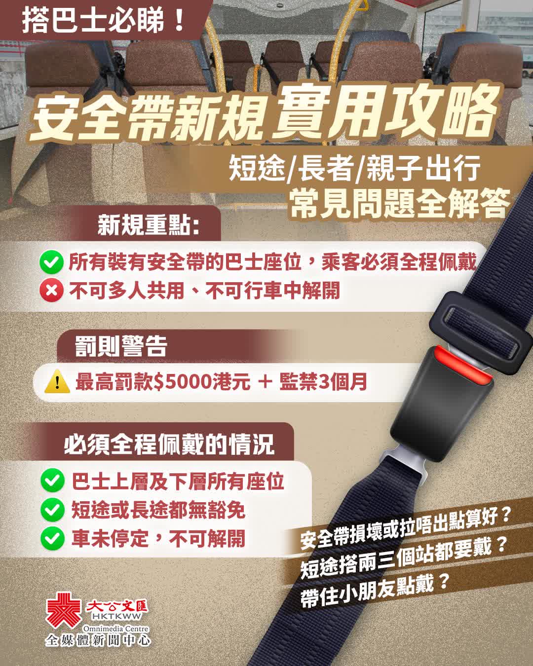 大公文匯全媒體報道,巴士佩戴安全帶新規定將於1月25日(星期日)開始實施,規定凡巴士座位已裝設安全帶,乘客必須全程佩戴,違者最高可被罰款5000港元及監禁3個月。運輸署呼籲市民「如有安全帶,坐低就要戴」,以保障出行安全。為助市民順利適應新規,避免誤觸法例,大文整合官方資訊、及常見疑問,提供最實用的「巴士安全帶懶人包」!