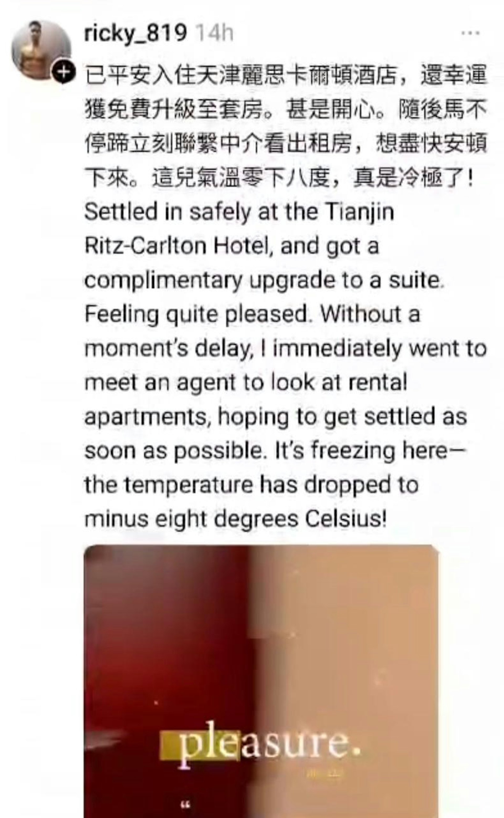 大公文匯全媒體報道,「廉潔守正」是《公務員守則》的重中之重,特區政府駐天津聯絡處主任鄭震生早前在社交平台公開大曬受噴射飛航高級管理人員安排,坐私人船艙由香港去澳門。他又分享入住天津一間酒店時,「幸運獲免費升級至套房」。相關帖文引起網民討論,被質疑不正當收受利益。