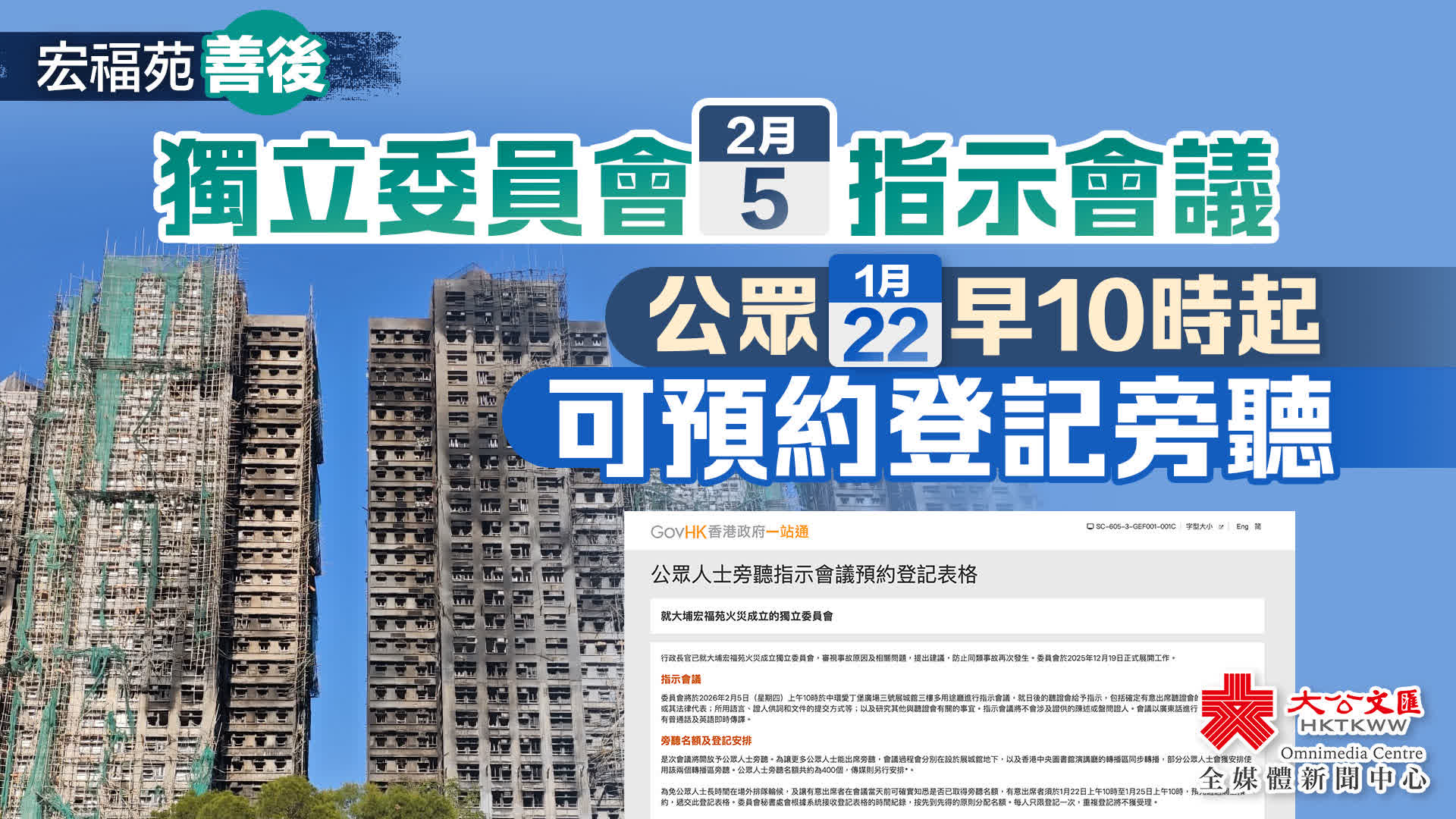大公文匯全媒體報道,就大埔宏福苑火災成立的獨立委員會昨日(21日)公布,公眾人士可於今日(22日)上午10時至1月25日上午10時期間透過網上預約,登記出席旁聽指示會議。