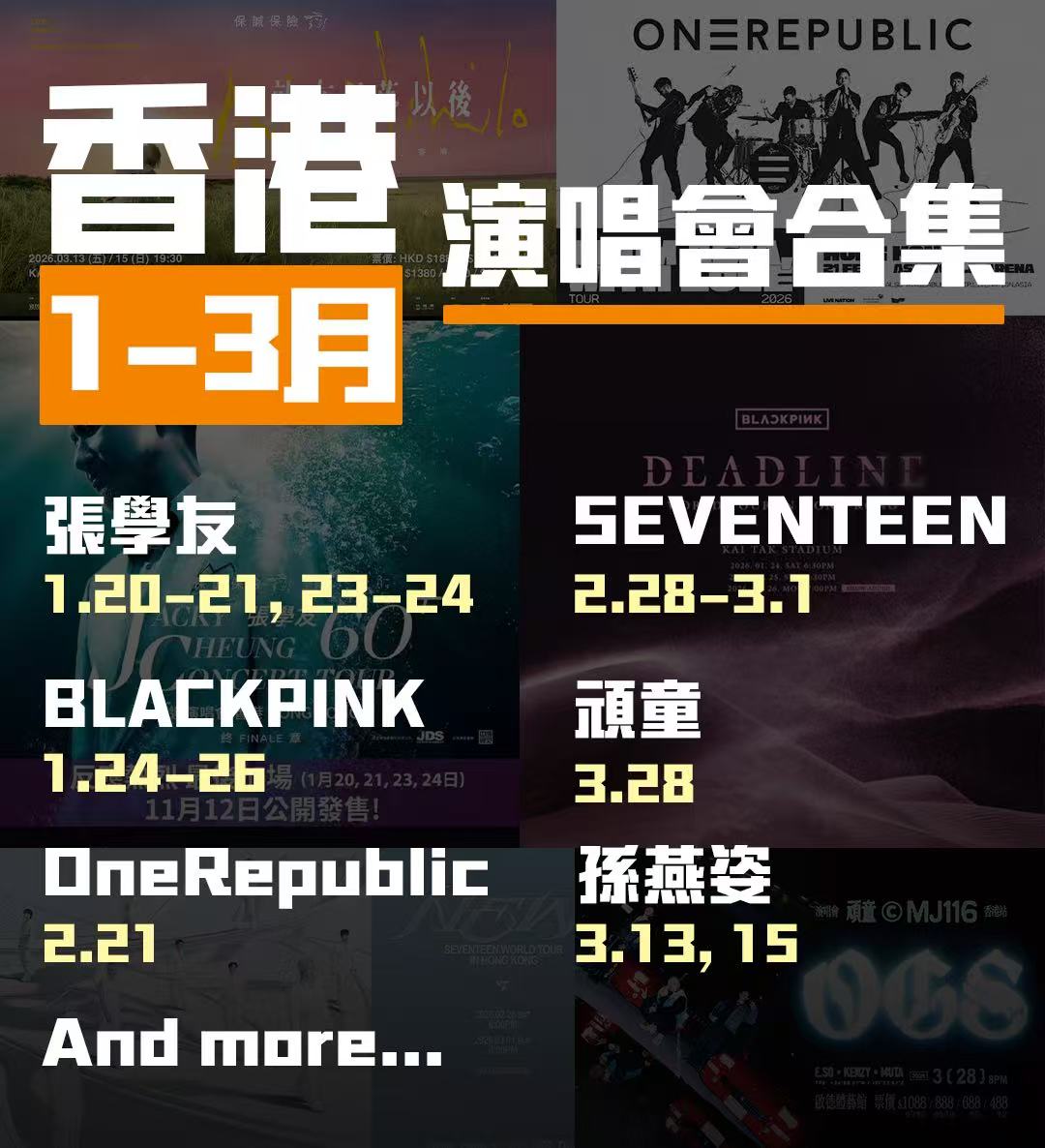 大公文匯全媒體報道,2026年首季香港演唱會市場迎來「史上最高密度」檔期!短短90天內超過35場大型演出輪番轟炸,BLACKPINK、SEVENTEEN、TXT等韓流霸主先後攻佔啟德主場館;張學友、黎明兩大天王紅館對決;從紅館的經典金曲盛宴,到啟德主場館的頂流狂歡,再到亞博館的多元音樂現場,覆蓋華語樂壇常青樹、韓流頂流團體、實力唱將與獨立音樂人,無論您是K-POP鐵粉、粵語金曲迷還是獨立音樂愛好者,這個季度總有一場讓你「掏空錢包」的演出!