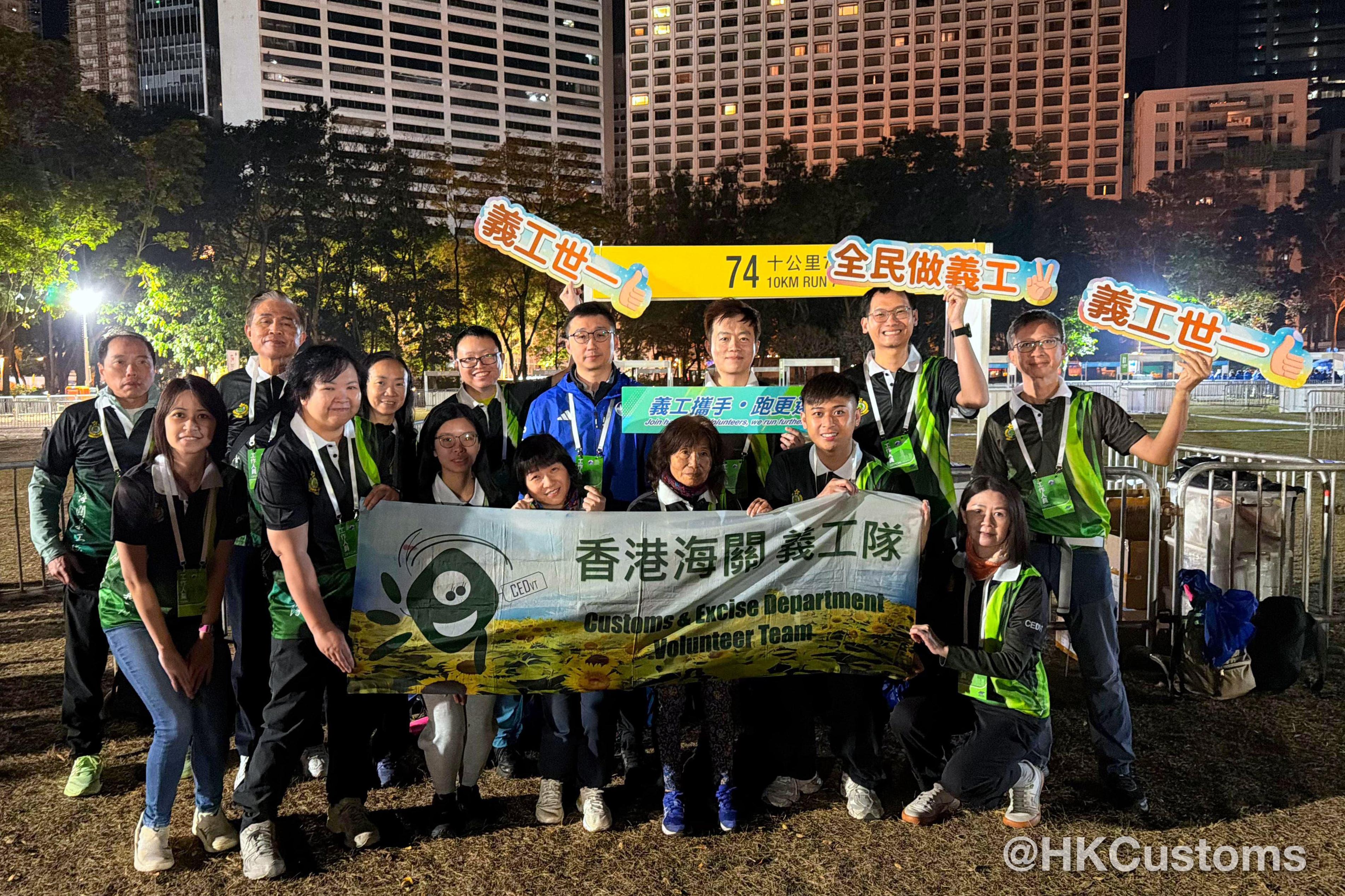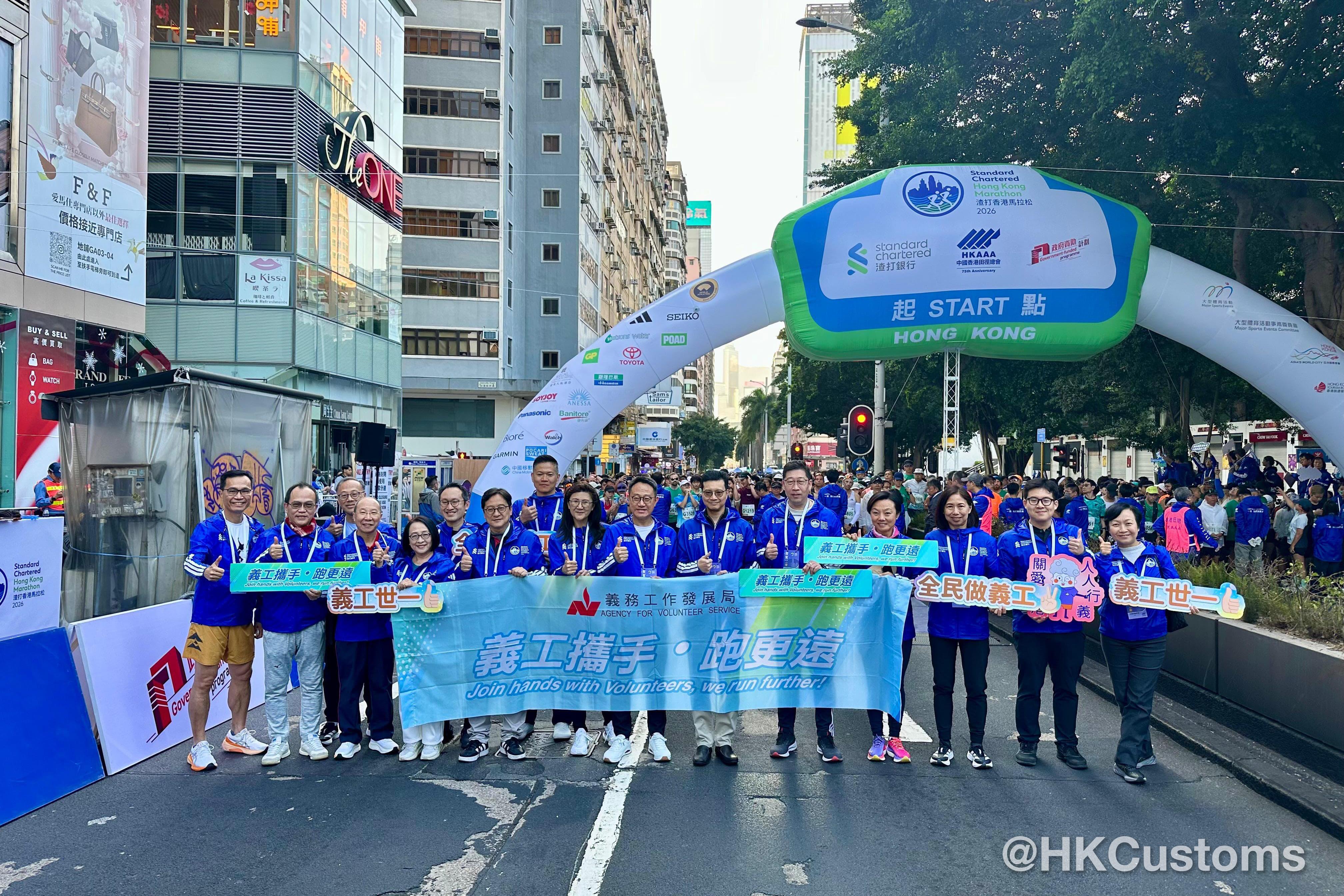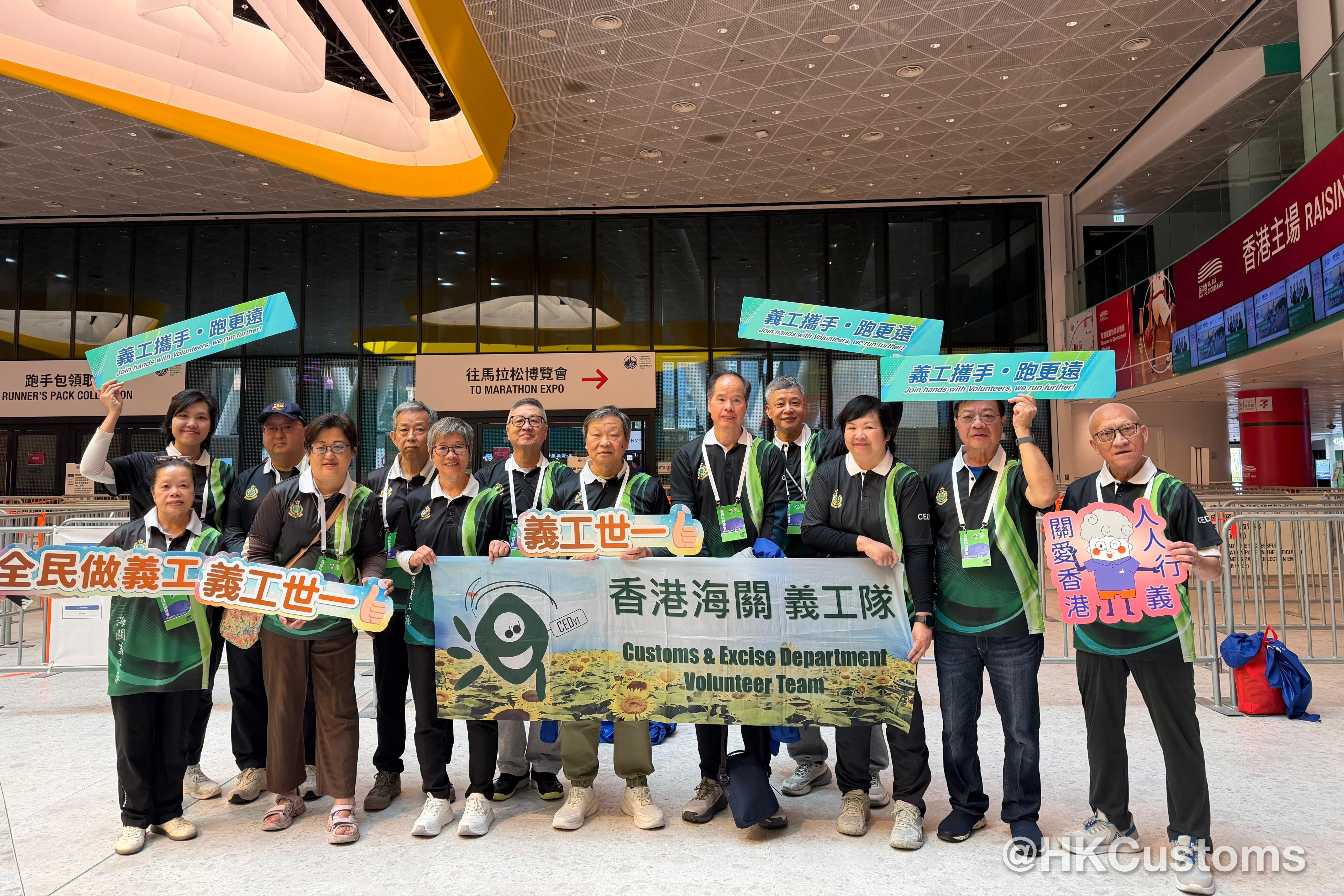 是次馬拉松有超過7萬人參與,海關義工隊全力支援。他們除了在賽前於啟德體藝館協助分發跑手包,賽事當日清晨亦於維園安排行李寄存,讓參賽者可輕鬆上陣。