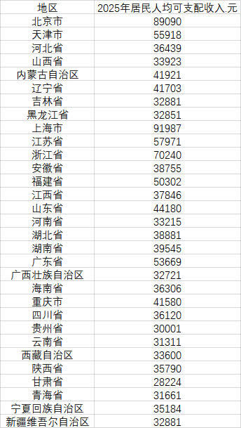 國家統計局網站公布了31個省份2025年居民人均可支配收入情況。數據顯示,去年7個省份居民人均可支配收入超過了5萬元。