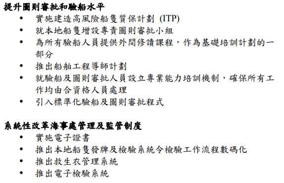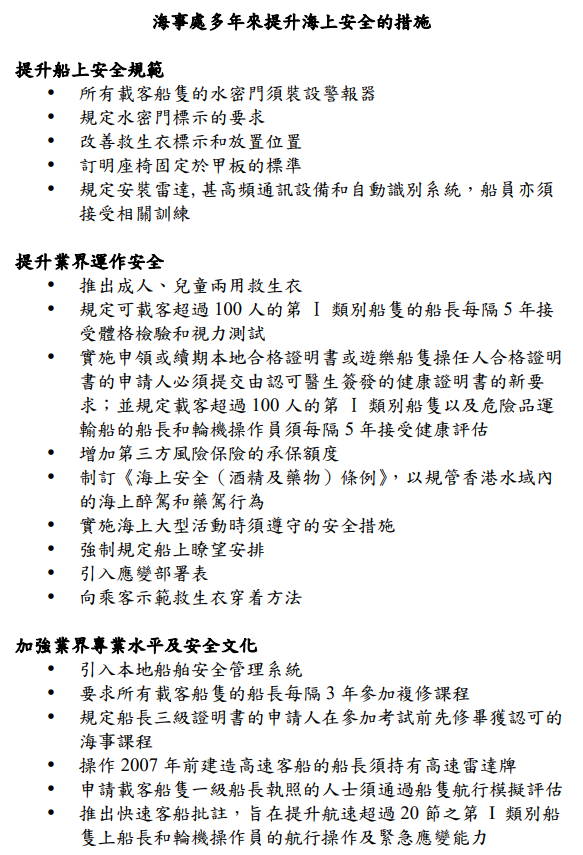 政府發言人表示,局方一直督促海事處努力跟進調查委員會及專家提出的建議,並採取系統性方針,全面落實5大類措施,以加強保障海上安全,避免類似事故發生,包括提升船上安全規範、提升圖則審批和驗船水平、提升業界運作安全、加強業界專業水平及安全文化、以及系統性改革海事處管理及監管制度。