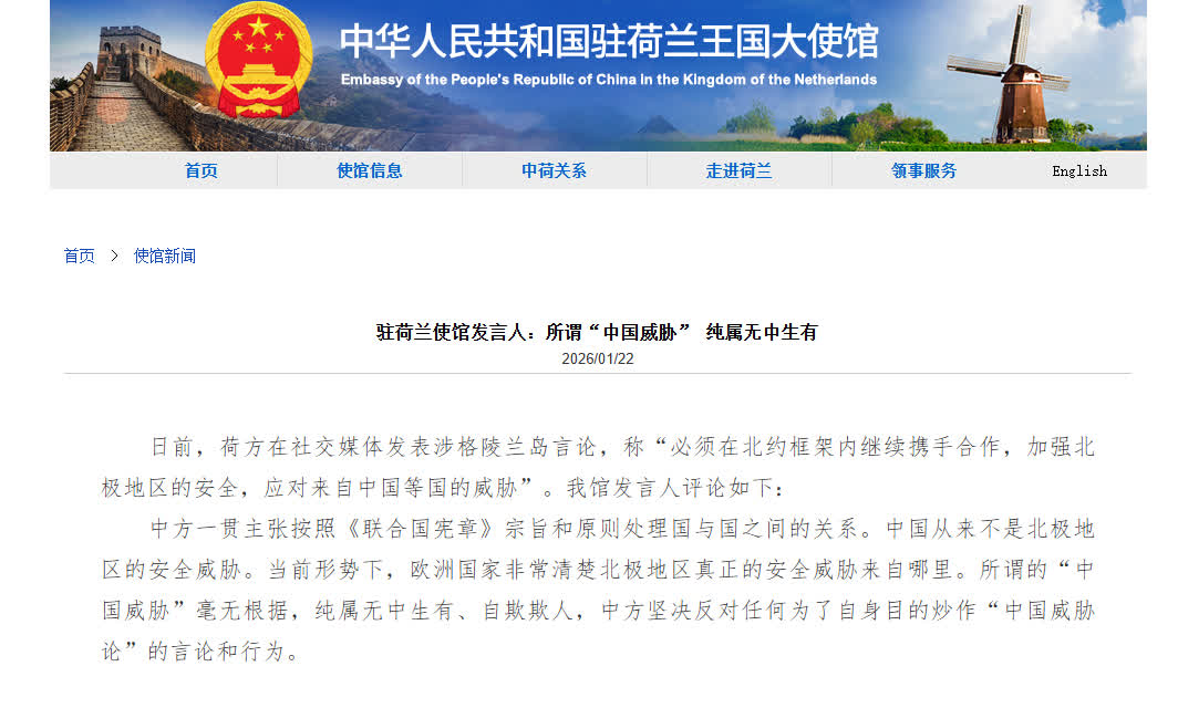 據中新網報道,中國駐荷蘭使館22日發表評論,駁斥荷蘭涉格陵蘭島言論,強調所謂「中國威脅」純屬無中生有。