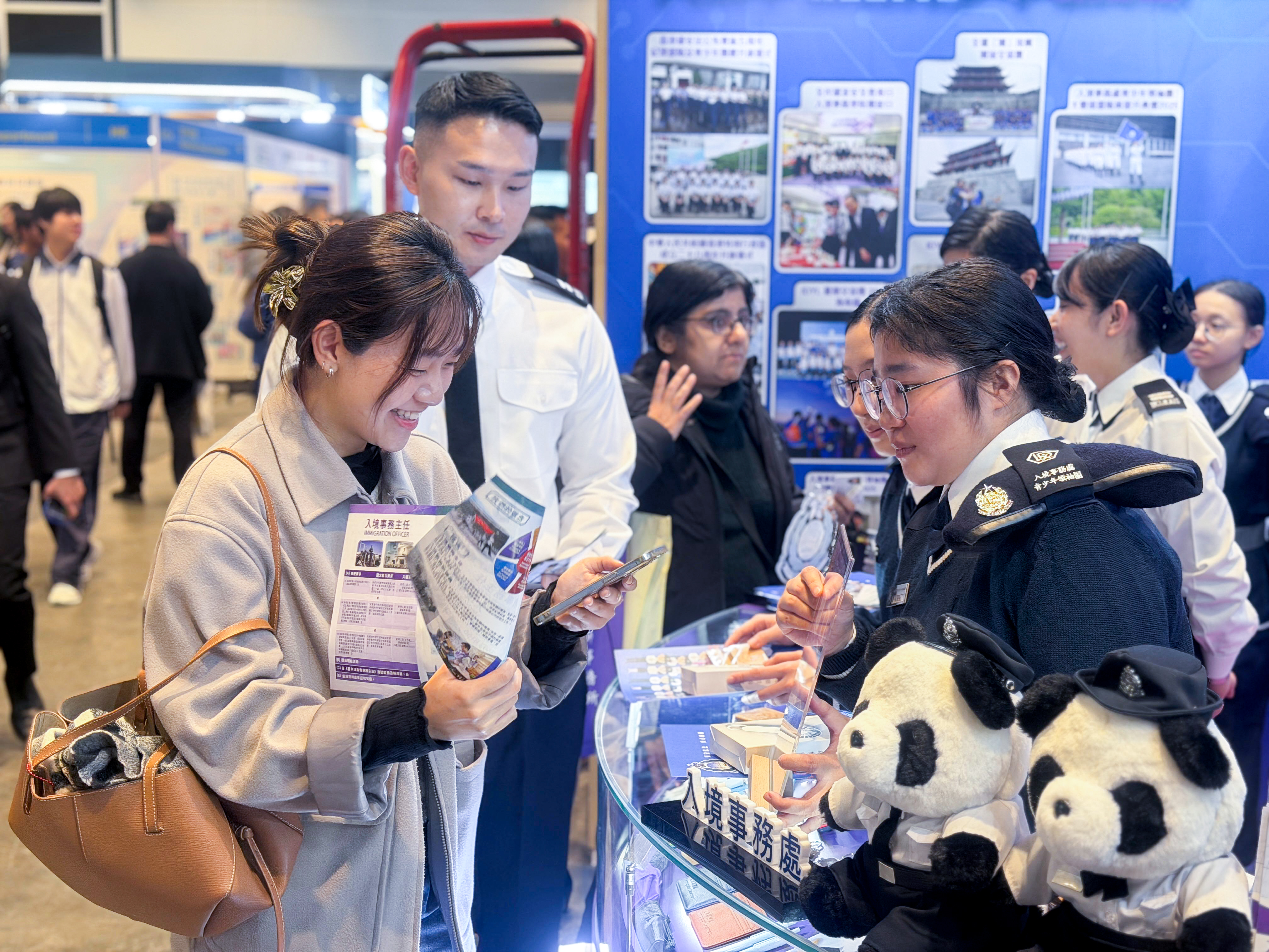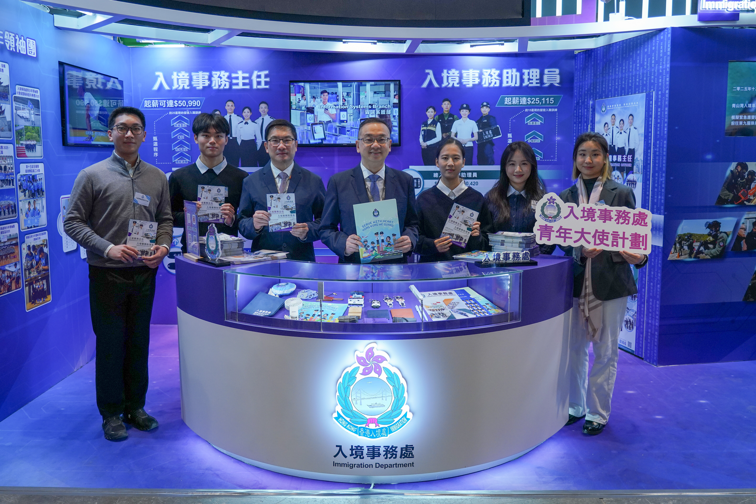 入境處今年繼續全力響應教育及職業博覽2026,由1月22日開始,我們一連四天在香港會議展覽中心向公眾宣傳招聘資訊,包括:入境事務主任和入境事務助理員的日常職責、入職條件、薪酬福利和晉升機會等等,參觀的市民還有機會換取精美的入境處紀念品!