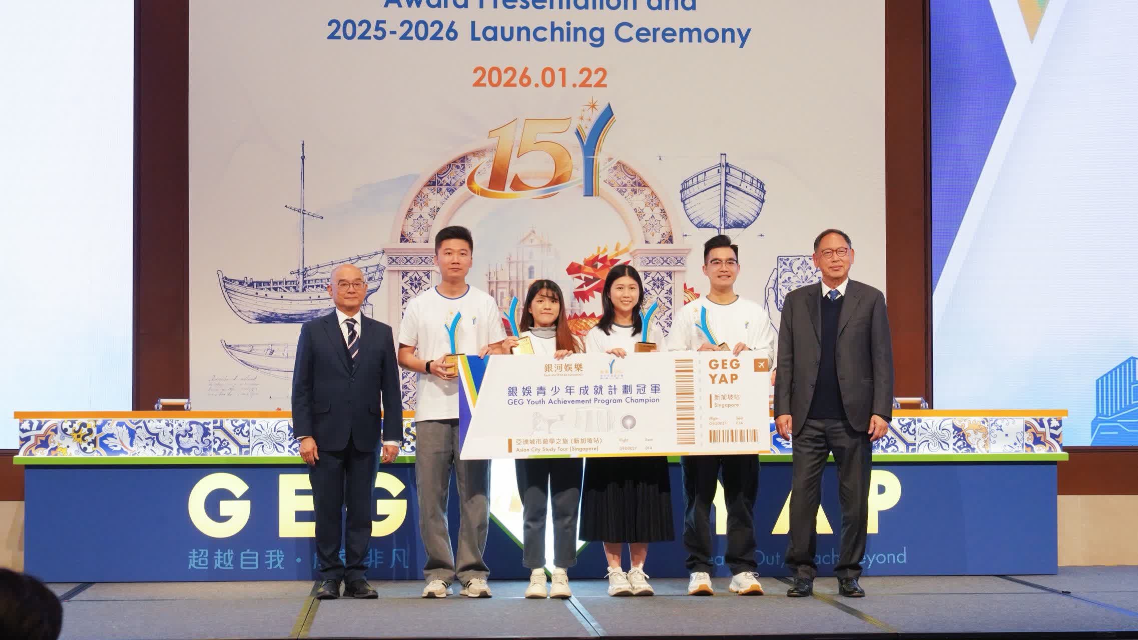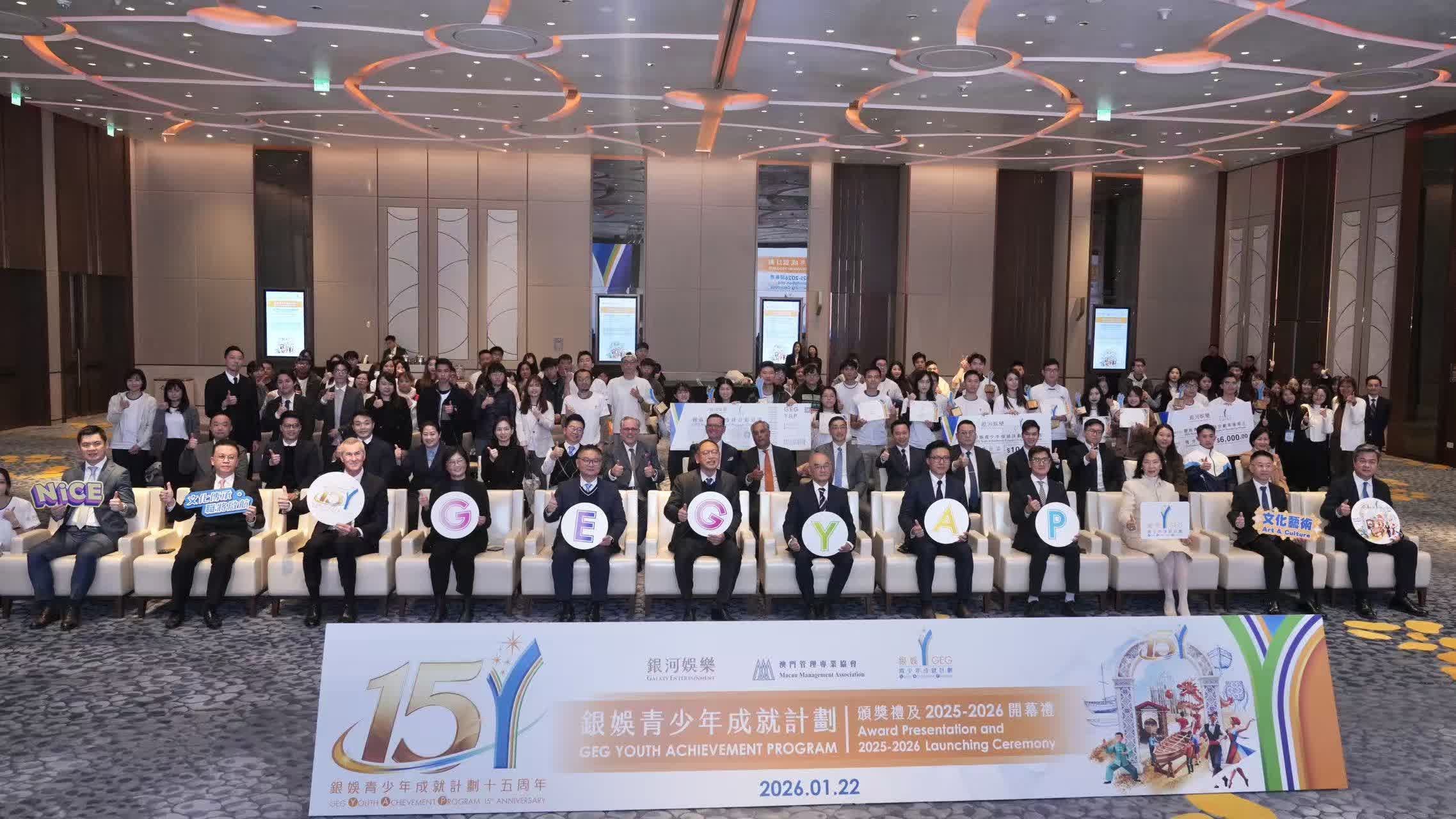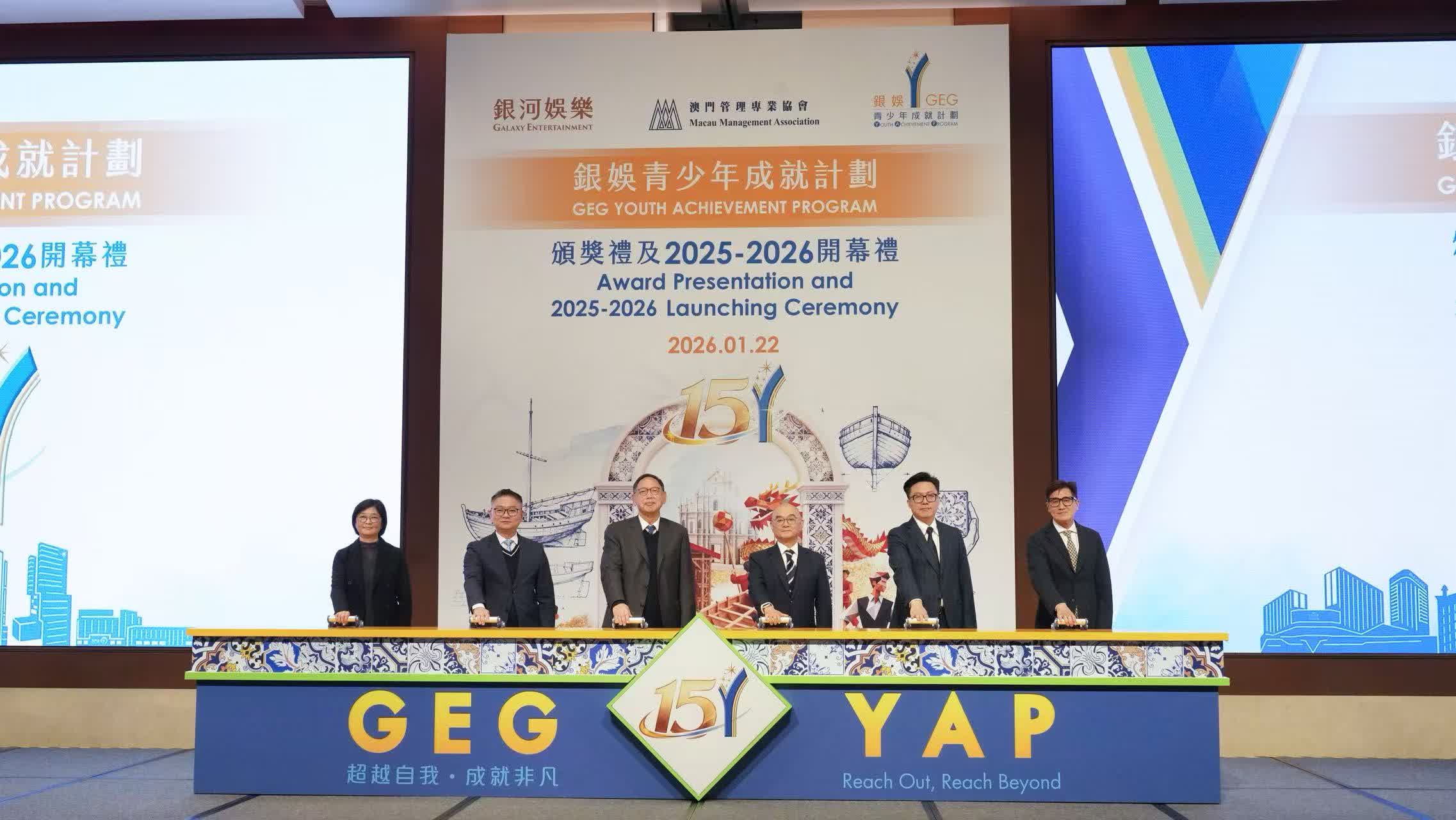 銀娛攜手澳門管理專業協會合辦的「銀娛青少年成就計劃」昨(22)日於銀河國際會議中心舉行第 14 屆頒獎禮暨第 15 屆開幕禮,表彰學員過去一年的卓越成果,並為新一屆計劃揭開序幕。