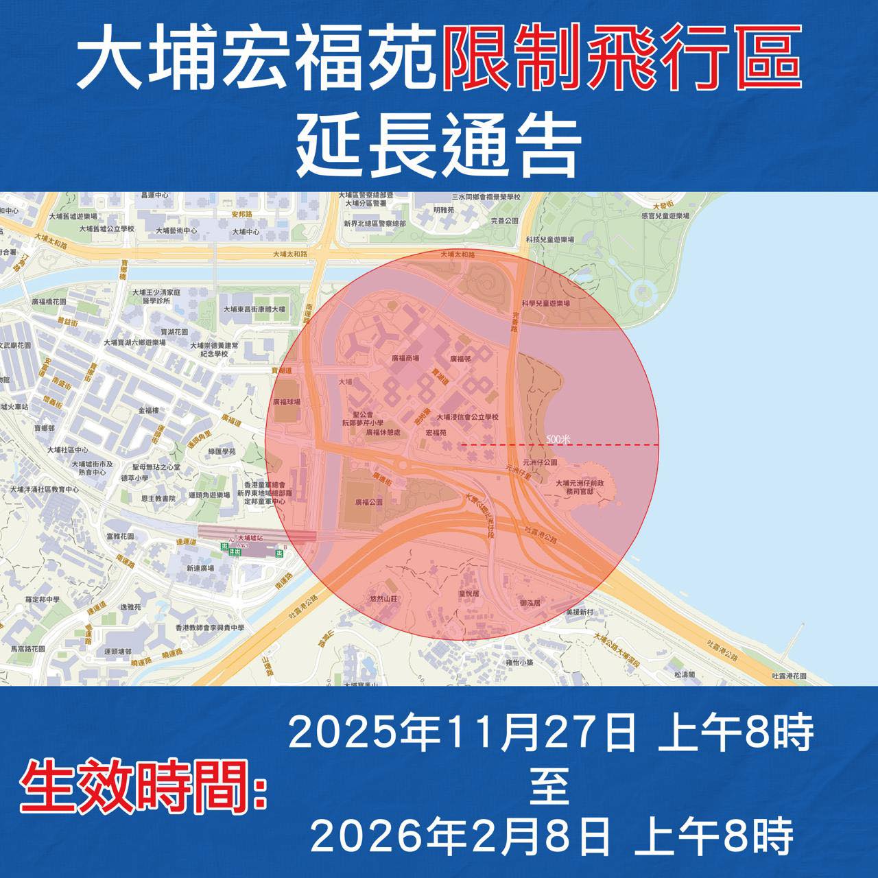 大公文匯全媒體報道,警方今日(23日)表示,鑒於公眾安全,警務處在大埔宏福苑範圍已設立「限制飛行區」。生效時間將會由2026年1月25日上午8時延長至2026年2月8日上午8時。
