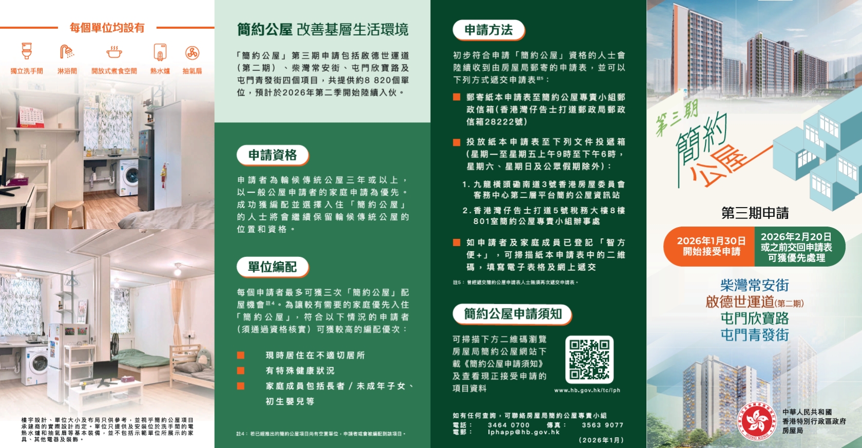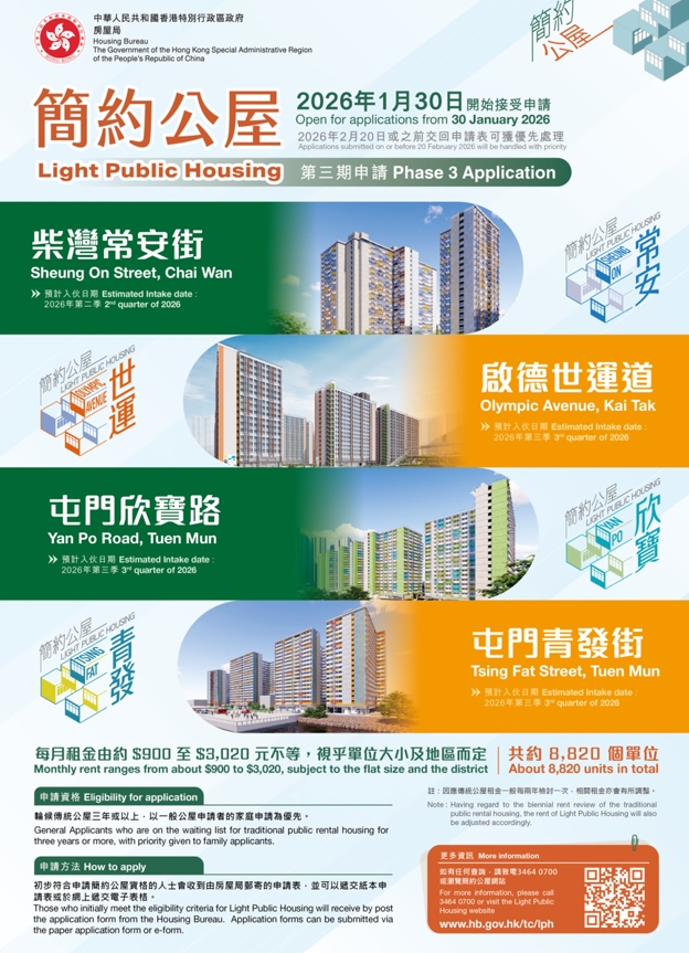 有關「簡約公屋」第三期申請的更多資料可瀏覽房屋局「簡約公屋」網站(點擊瀏覽)。如有查詢,可致電3464 0700或電郵至lphapp@hb.gov.hk。