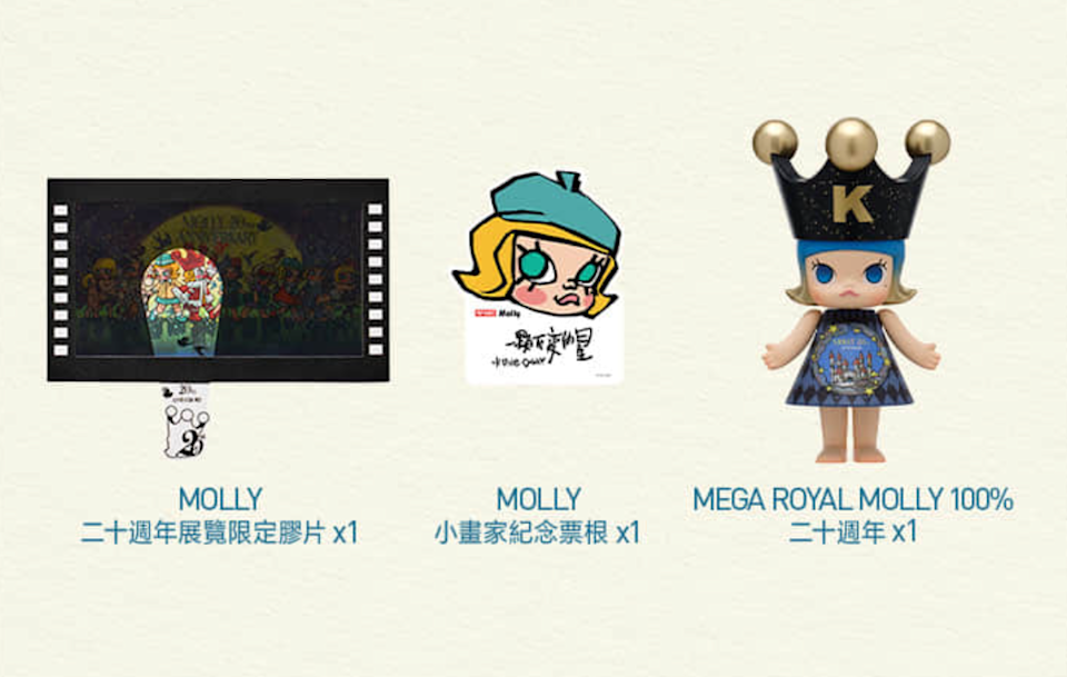 $299(VIP票):包含單人入場資格及展覽紀念品1份(MOLLY二十周年展覽限定菲林膠片/小畫家紀念票尾/MEGA ROYAL MOLLY 100%二十周年限定款一隻)