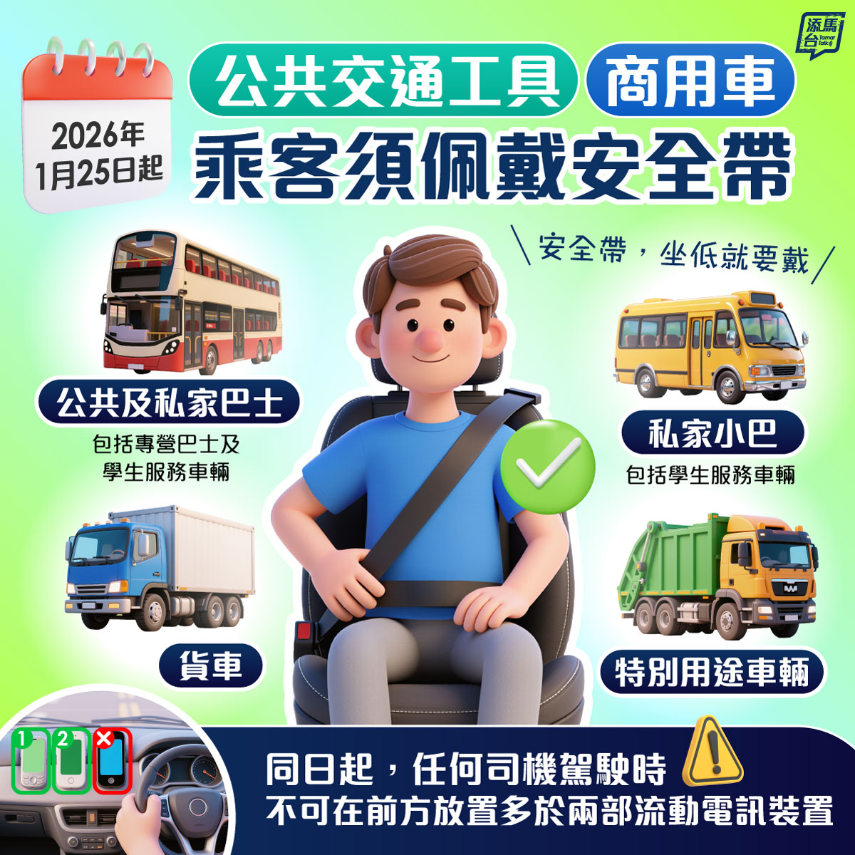 由今日起,所有新登記的公共及私家巴士的所有乘客座位,私家小巴和貨車的後排乘客座位,以及特別用途車輛的司機和所有乘客座位,均須安裝安全帶。乘坐這些車輛時,如座位已安裝安全帶,不論車輛是否新登記,司機和座位乘客均須佩戴。研究顯示,佩戴安全帶可減低司機和乘客在迎頭相撞意外中死亡和重傷的風險分別約四成和七成。