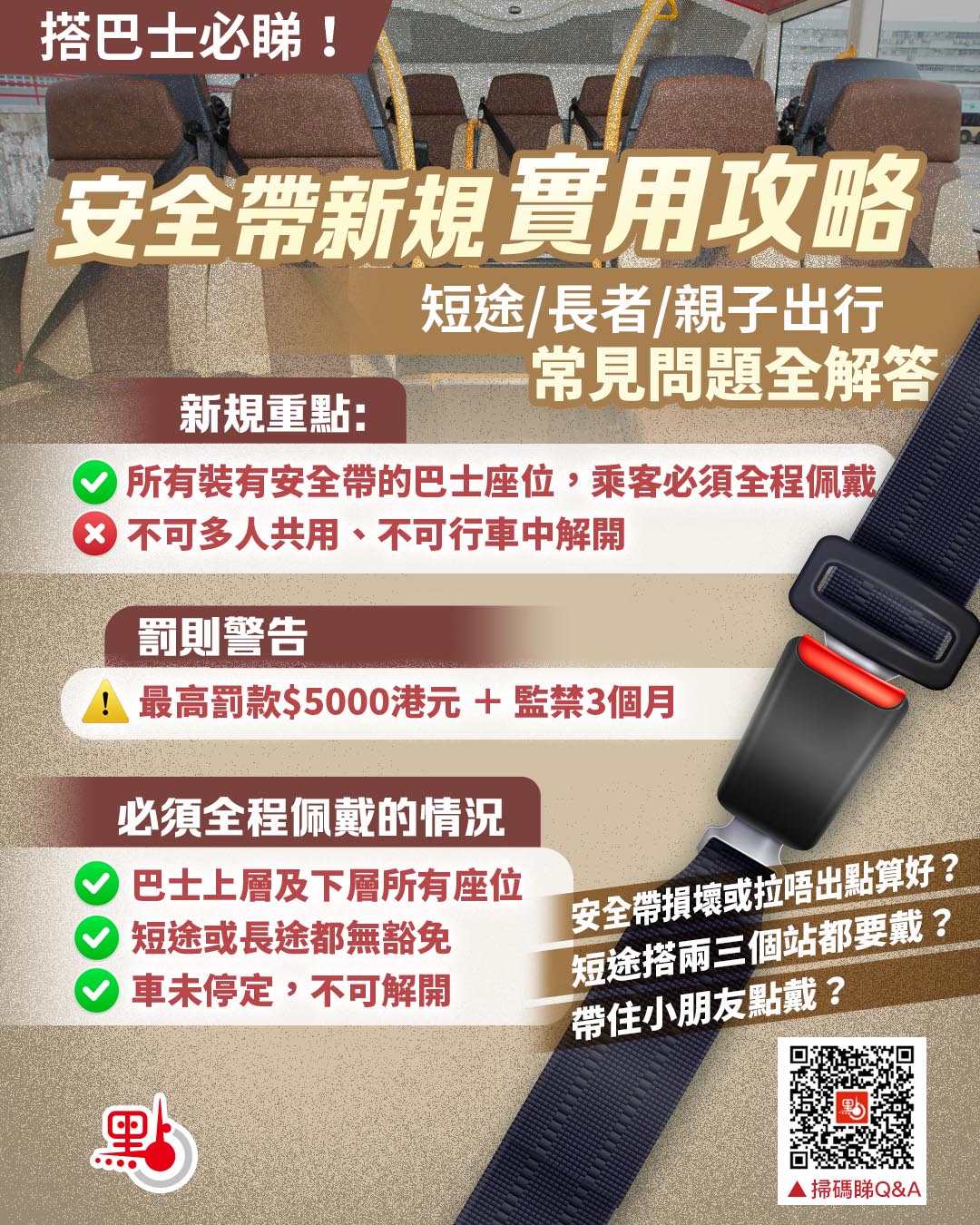 運輸署呼籲市民「如有安全帶,坐低就要戴」,以保障出行安全。為助市民順利適應新規,避免誤觸法例,大公文匯全媒體整合官方資訊、及常見疑問,提供最實用的「巴士安全帶懶人包」!
