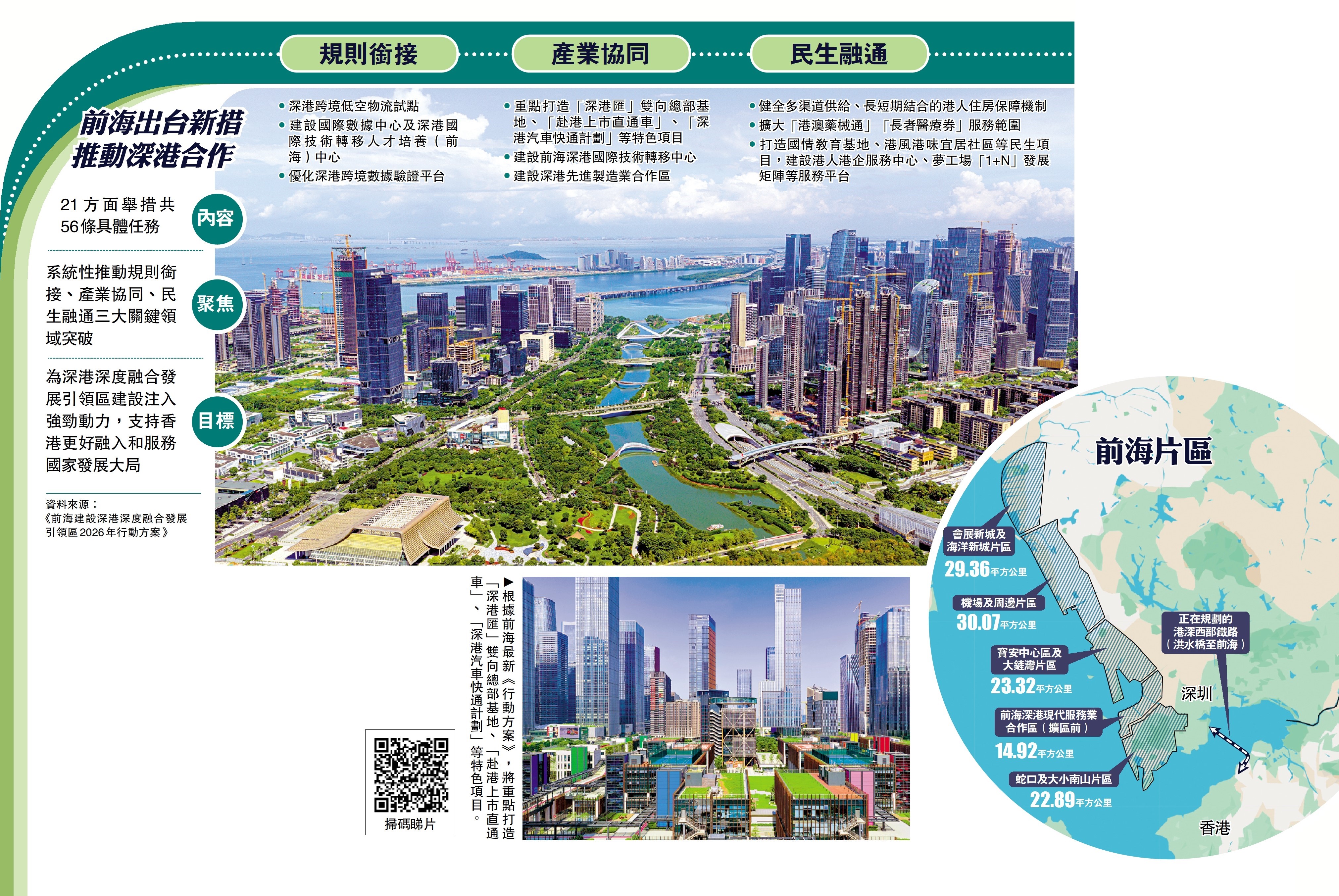 根據最新出台的前海《行動方案》,在加強產業協同,建設深港現代服務業高質量發展新高地方面,涵蓋8方面工作舉措,包括加快「深港匯」雙向總部基地建設,支持香港鞏固提升國際金融、航運、貿易中心地位,支持香港建設國際創新科技中心、中外文化藝術交流中心,助力香港專業服務業拓展內地市場,積極參與香港北部都會區建設,依託深圳舉辦APEC會議的契機拓展國際經貿合作網絡。