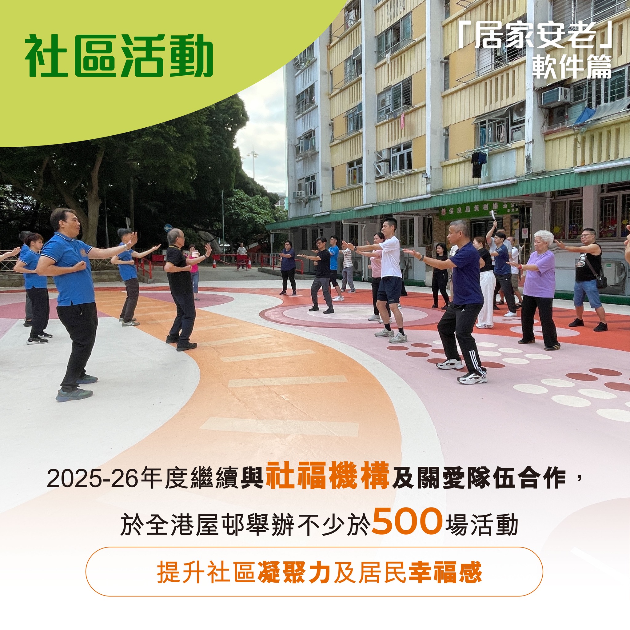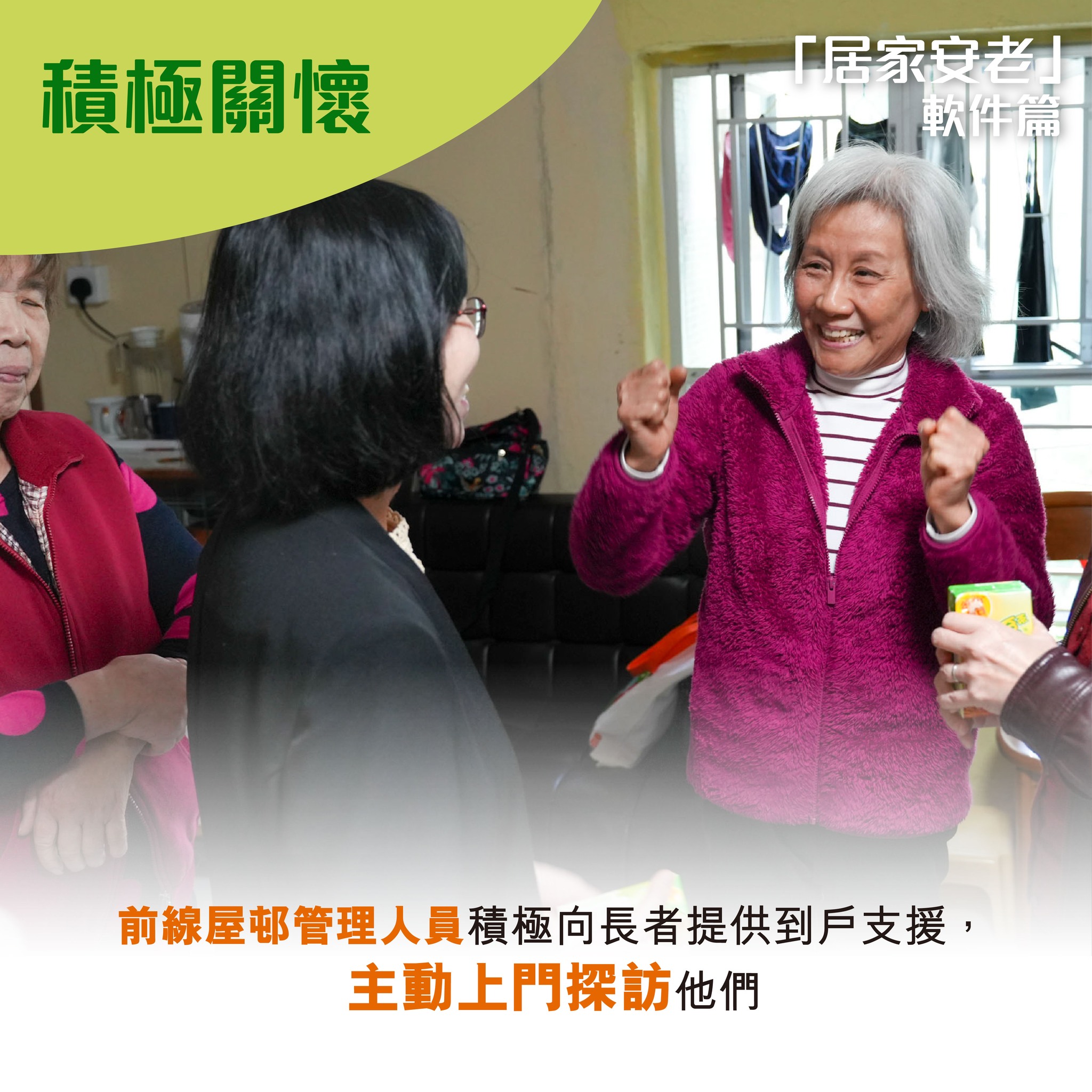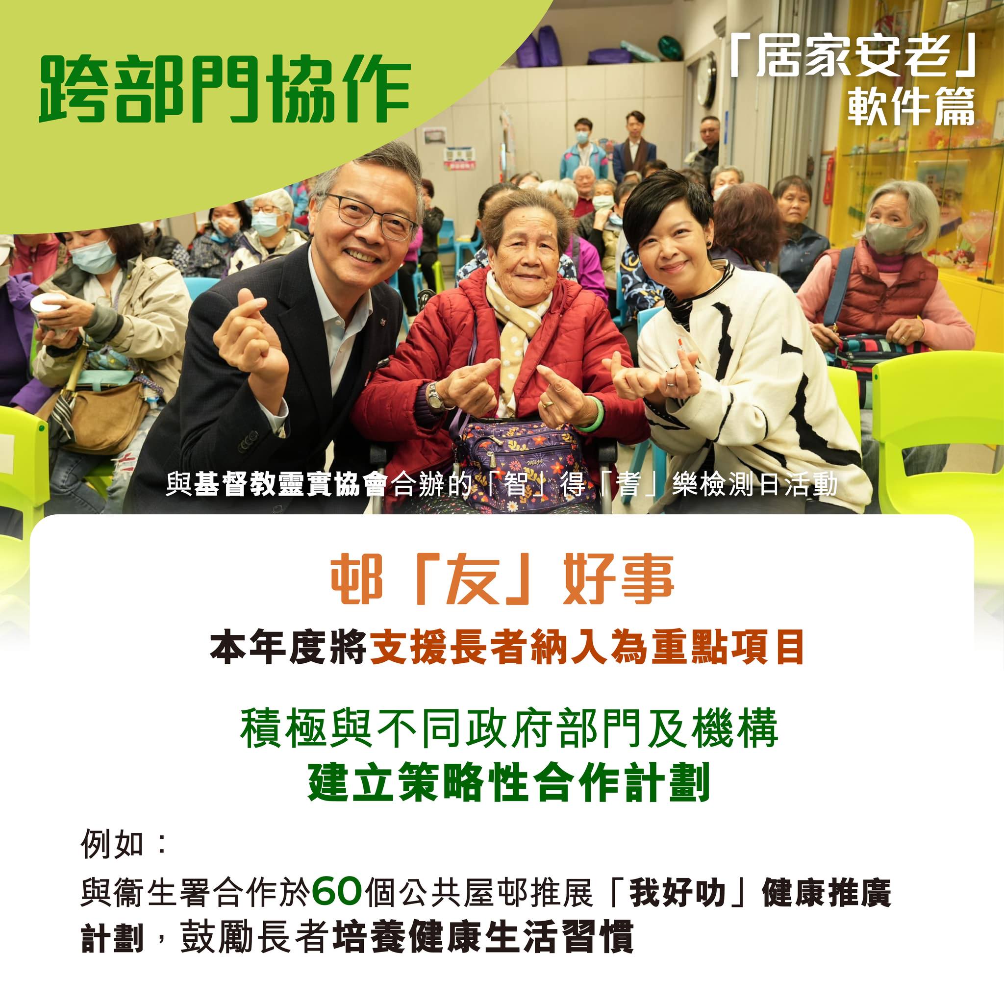 何永賢指出,當局本年度的「邨『友』好事」將支援長者納入為重點項目,積極與不同政府部門及機構合作,例如與衞生署合作於60個屋邨推展「我好叻」健康推廣計劃,鼓勵長者培養健康生活習慣等。在政策上,有「高齡單身人士」優先配屋計劃、「共享頤年」優先配屋計劃及「天倫樂」優先配屋計劃,過去10年已有約70000個家庭受惠於這些計劃。年滿70歲或以上的長者,包括全長者寬敞戶、居於一型設計的長者住屋或無獨立設備的「改建一人單位」住戶,如自願調遷至一個面積較小的公屋單位,可獲終身免租。在資助出售單位方面,也有「家有長者優先選樓計劃」及「長者業主樓換樓計劃」,讓長者或有長者的家庭有更多機會選擇合適居所。