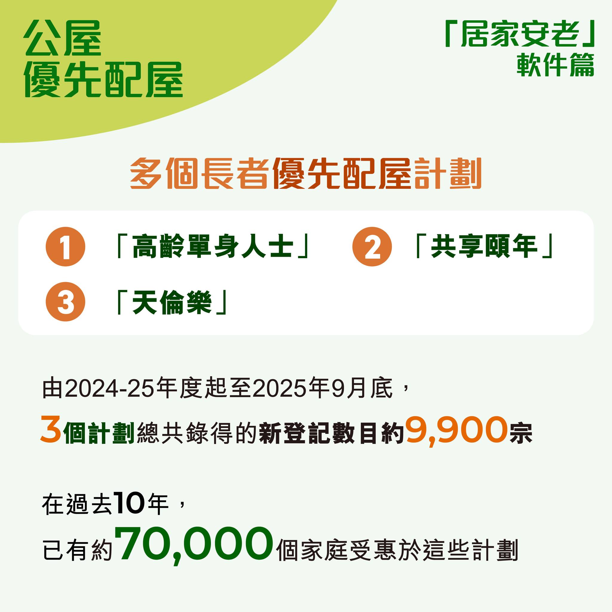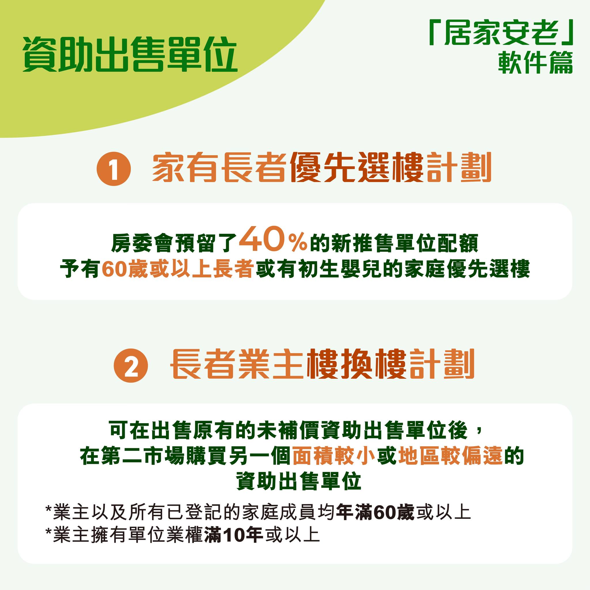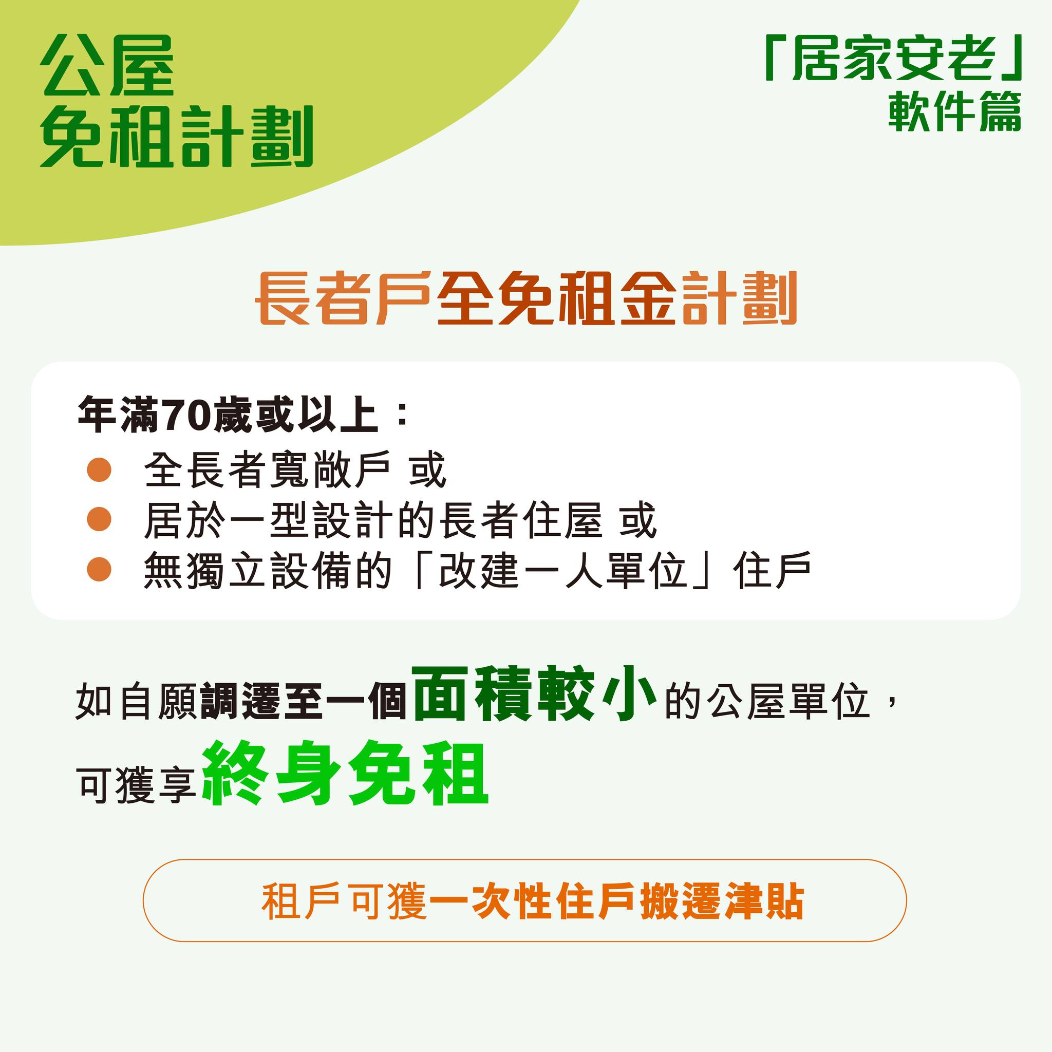 何永賢指出,當局本年度的「邨『友』好事」將支援長者納入為重點項目,積極與不同政府部門及機構合作,例如與衞生署合作於60個屋邨推展「我好叻」健康推廣計劃,鼓勵長者培養健康生活習慣等。在政策上,有「高齡單身人士」優先配屋計劃、「共享頤年」優先配屋計劃及「天倫樂」優先配屋計劃,過去10年已有約70000個家庭受惠於這些計劃。年滿70歲或以上的長者,包括全長者寬敞戶、居於一型設計的長者住屋或無獨立設備的「改建一人單位」住戶,如自願調遷至一個面積較小的公屋單位,可獲終身免租。在資助出售單位方面,也有「家有長者優先選樓計劃」及「長者業主樓換樓計劃」,讓長者或有長者的家庭有更多機會選擇合適居所。