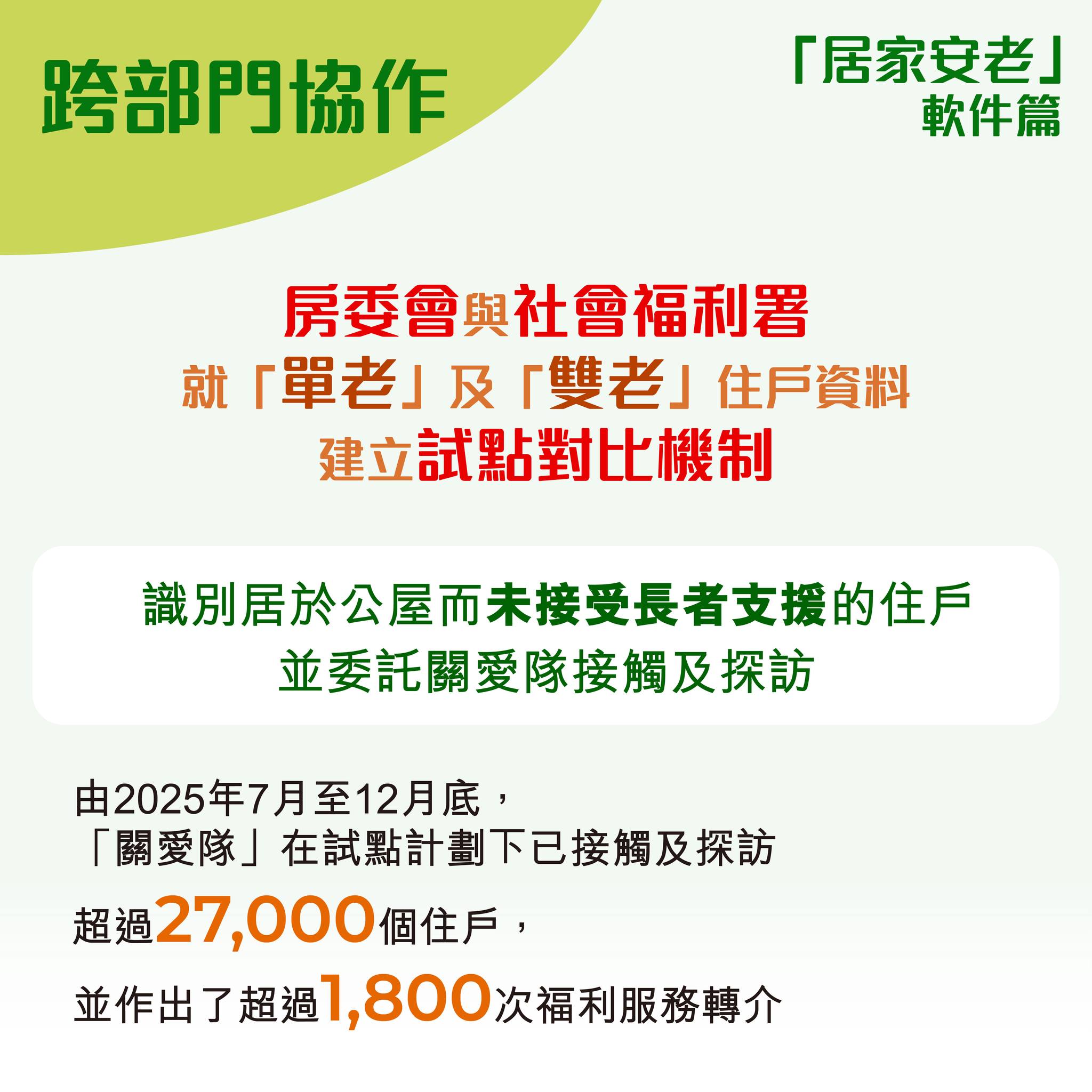 大公文匯全媒體報道,房屋局局長何永賢今日(25日)在社交平台發文分享房屋署在關懷長者、推行各種支援與便利措施上的一系列工作。何永賢表示,當局注重長者得到的實際關心與支援,除了屋邨管理人員會主動上門探訪,房委會還與社會福利署就「單老」及「雙老」住戶資料建立試點對比機制,由去年7月至12月底,「關愛隊」在試點計劃下已接觸及探訪超過27000個住戶,並作出了逾1800次福利服務轉介。