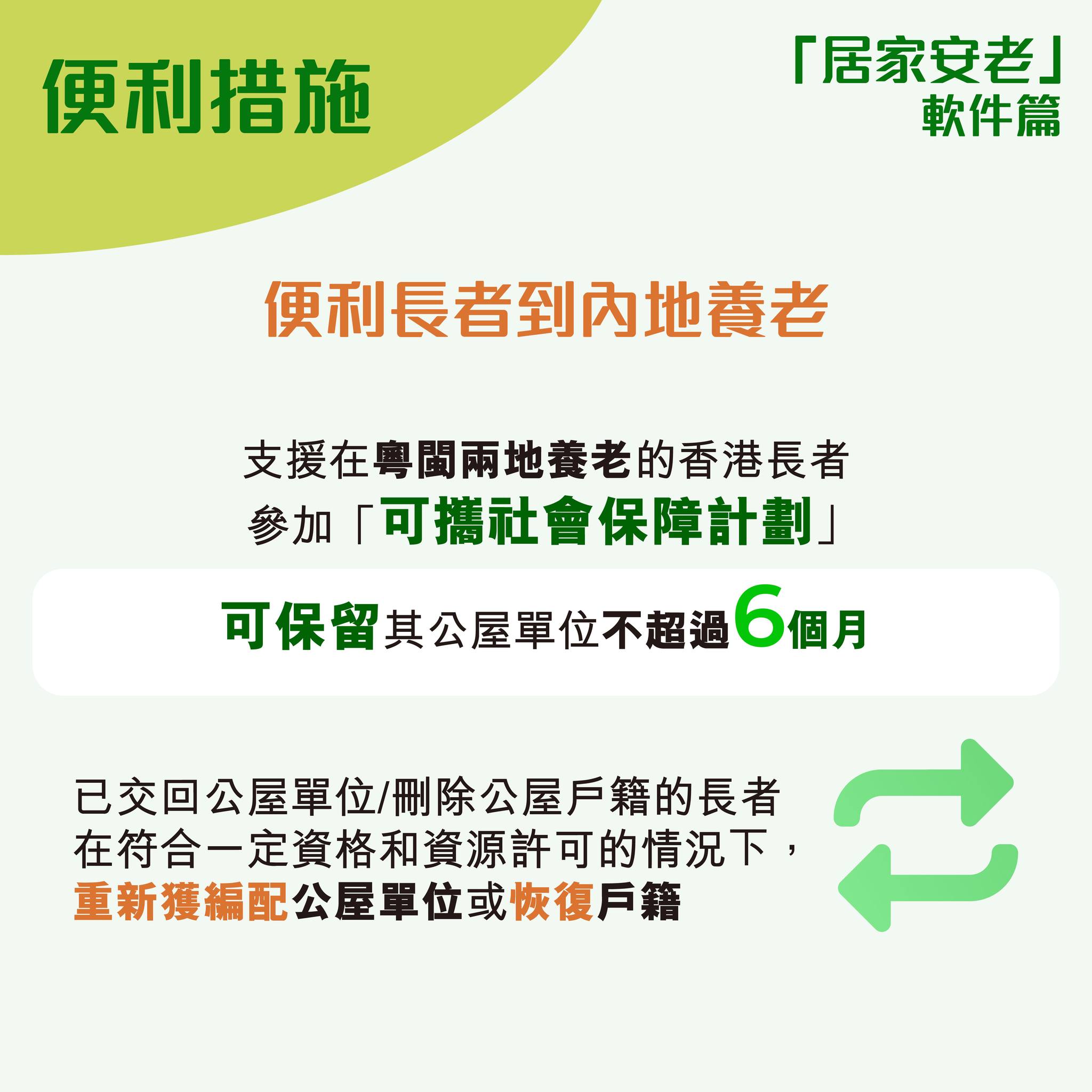 何永賢表示,有見一些長者選擇到內地養老,但又怕適應不了或需回港,當局支援參加「可攜社會保障計劃」、在粵閩兩地養老的香港長者,可保留其公屋單位不超過6個月。已交回公屋單位或刪除公屋戶籍的長者,在符合一定資格和資源許可下,可重新獲編配公屋單位或恢復戶籍。她強調,要讓長者安居,更多「以人為本」、貼心的服務支援是非常重要的,未來會與相關部門一起努力,用心為「老友記」服務。