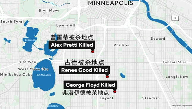 據央視新聞報道,當地時間24日上午,美國明尼蘇達州最大城市明尼阿波利斯又發生一起移民執法槍擊事件,造成37歲男子亞歷克斯·普雷蒂死亡。據悉,普雷蒂被聯邦執法人員槍殺的地點距離本月7日古德被槍殺的地點僅幾公里,並且都在2020年弗洛伊德案事發地附近。