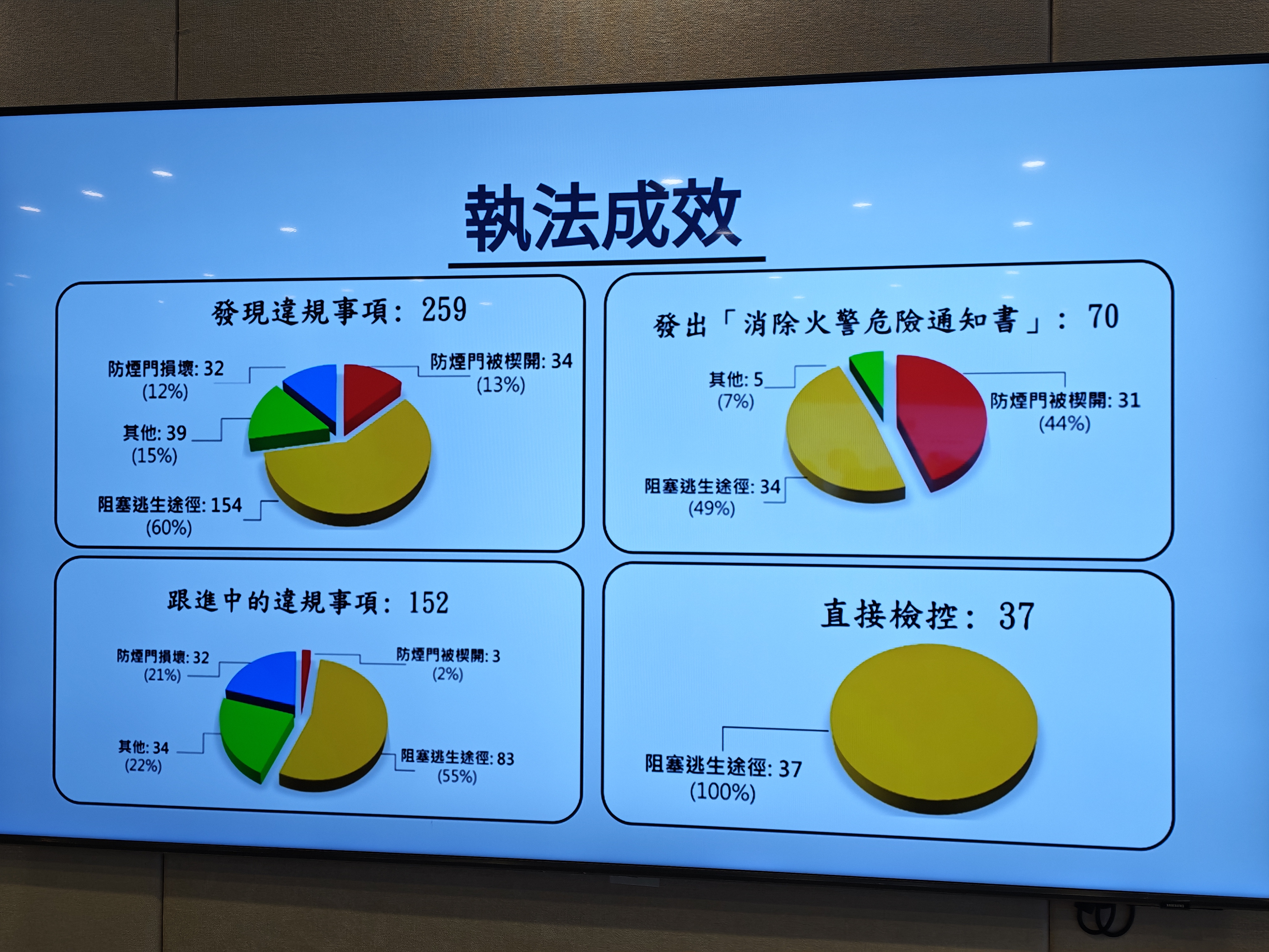 高級消防區長(樓宇改善策略及特別行動)黎健武介紹,行動共發現259項違規,其中近六成涉及「阻塞逃生途徑」。他表示,關注到有大廈居民習慣使用升降機,而對樓梯間較少留意。他指樓梯是火警發生時的逃生通道,呼籲市民即便平時較少使用,也應關注其中是否存在火警隱患。