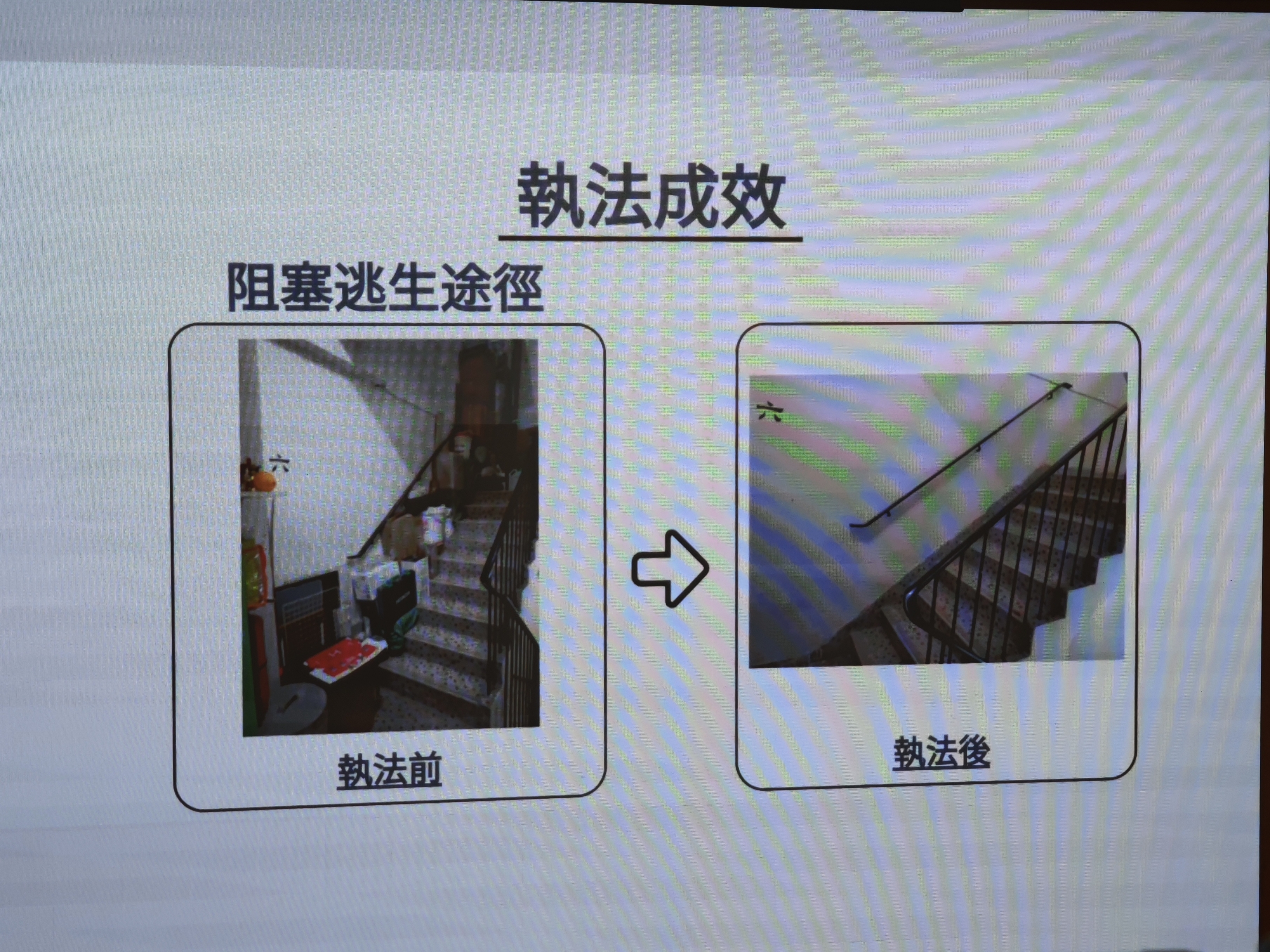 發現違規後該如何處理?馮景楠指,部門將繼續在地區力量協作下進行執法和宣傳教育。他以去年4月深水埗某「三無大廈」為例,「我哋即時向有關大廈發出通知書,同時聯同民政署、食環署、關愛隊等進行消防安全探訪」,最終數日內將阻塞清除。