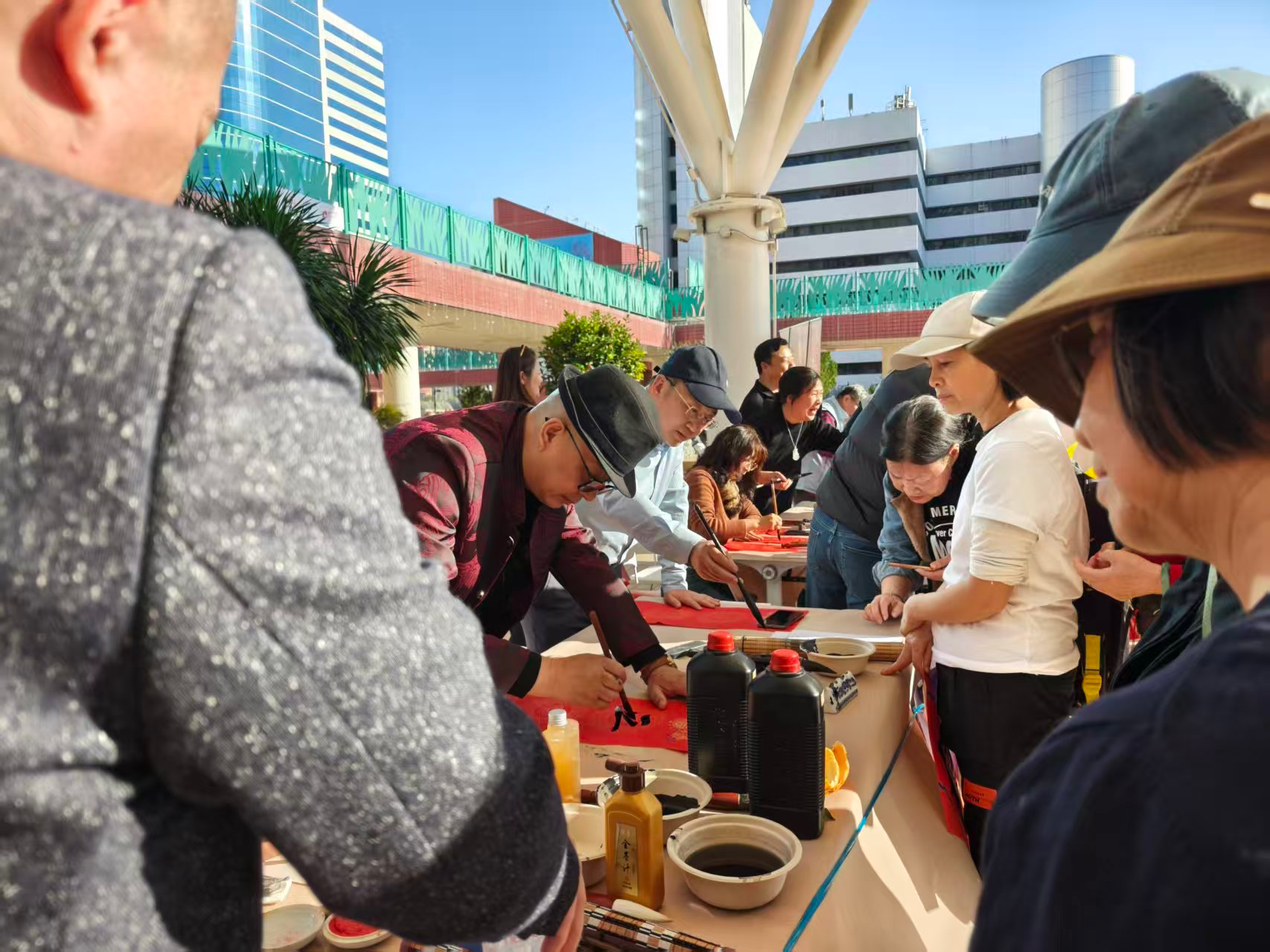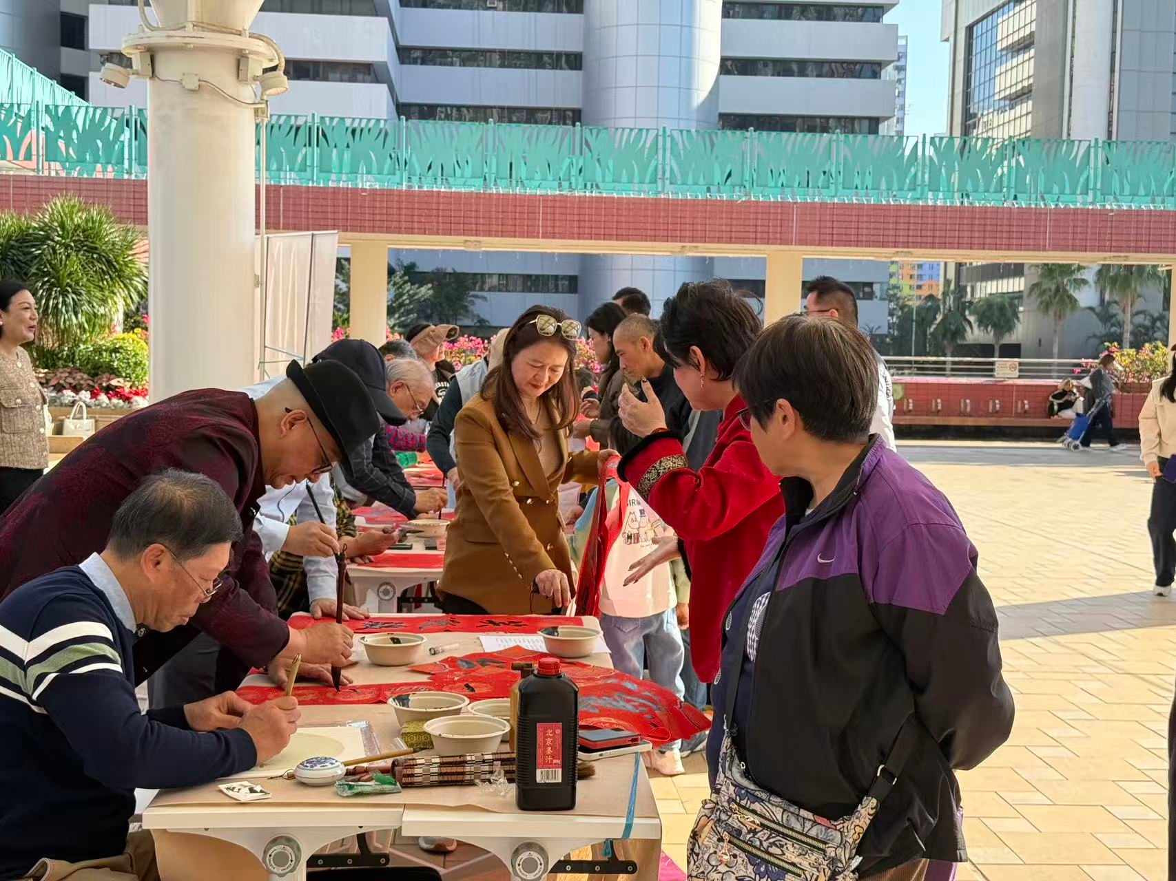 活動現場暖意融融,紅紙鋪陳,筆墨飄香。來自粵港兩地的十余位書畫名家與屯門區議員謝永恒,林的徽,謝玉玲,李超雄,鄭彥鈞, 崔景恒,陳孟宜,曾慶忠齊聚一堂,其中包括香港東方書畫院的資深藝術家與廣州市工商聯書畫藝術協會的骨幹成員,他們揮毫潑墨,運筆如飛。「門迎百福人財旺,戶納千祥闖家歡橫」;「春到堂前添瑞氣,輝盈庭內起祥雲」。