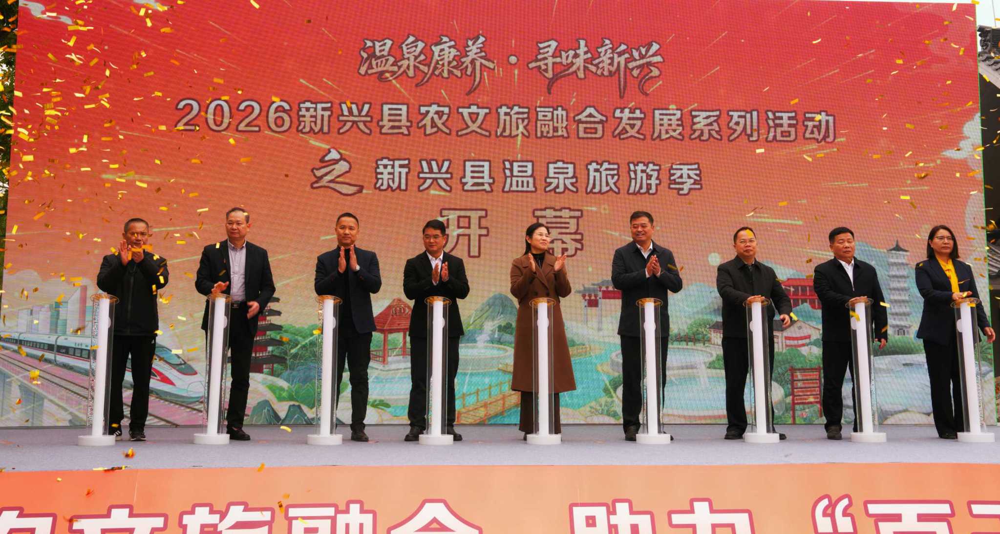 1月25日上午,「溫泉康養·尋味新興」2026廣東省雲浮市新興縣農文旅融合發展系列活動之溫泉旅遊季開幕式在六祖故里旅遊度假區遊客服務中心舉行,以實際行動推動「廣貨行天下」春季行動和農文旅融合發展。雲浮市副市長徐賢榮,新興縣委書記陳哲江,新興縣委副書記、縣長賴鑒銘等出席開幕式。新興縣旅遊協會、飲食行業協會代表,粵港澳大灣區旅行社代表,新興縣文旅企業負責人,美食博主,媒體記者和市民、遊客代表參加活動。