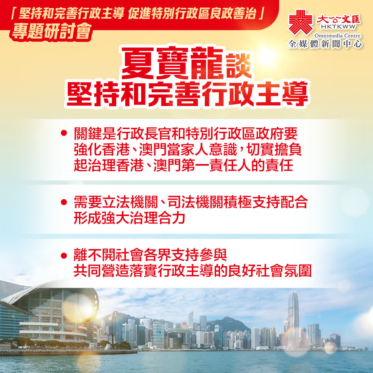 夏寶龍表示,堅持和完善行政主導,需要立法機關、司法機關積極支持配合,形成強大治理合力。特別行政區行政、立法、司法機關各司其職、各負其責、協作配合是行政主導體制的要義所在。行政、立法和司法機關的職權雖有分工,但根本目的是一樣的,就是在行政主導下為了治理好特別行政區,為了廣大市民的根本福祉和港澳的整體利益,要同唱一台戲,要多補台,不能拆台。立法機關、司法機關都要維護行政主導體制,尊重這一原則。