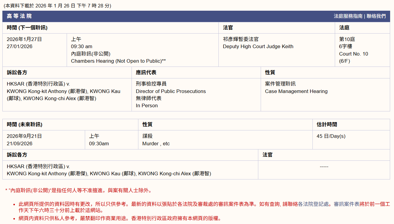 大公文匯全媒體報道,名媛蔡天鳳2023年被殺害及碎屍,前夫鄺港智、前家翁和前大伯被控謀殺及阻止合法埋葬屍體罪。據司法機構網站顯示,案件將於今年9月21日開審,料審45日。明日(27日)於高等法院進行非公開的案件管理聆訊。