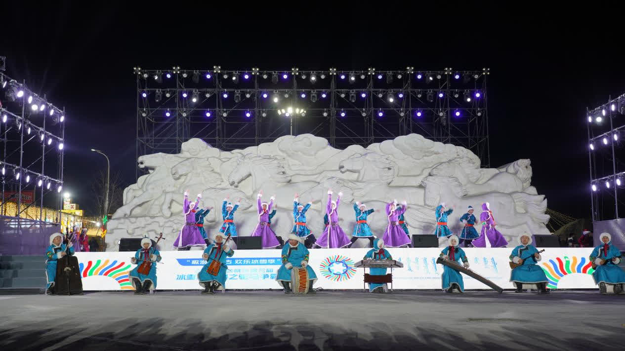 璀璨煙花騰空而起,在冰雪夜空綻放出萬千光影,將現場氛圍推向高潮。煙花落幕,歌手傾情演唱,樂手現場奏響,舞蹈演員翩翩起舞,還有民俗協會服飾隊、老幹部服飾隊、兒童服飾隊等表演者手捧哈達同步助演。歌聲悠揚、舞姿翩翩、哈達飄揚,將冰雪草原的壯闊與草原人民的熱忱展現的淋漓盡致,現場氣氛熱鬧非凡,寄託着廣大草原兒女對新時代美好生活的深情禮讚。