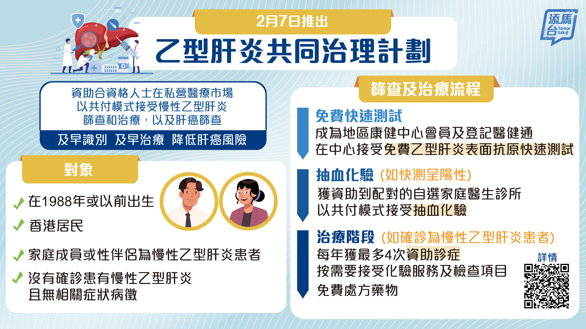 為及早識別社區中的慢性乙型肝炎患者並長期跟進,以減低他們出現肝硬化和肝癌等風險,「乙型肝炎共同治理計劃」將於2月7日推出,合資格人士可到地區康健中心報名參加計劃,以接受乙型肝炎風險評估、篩查和長期治理。