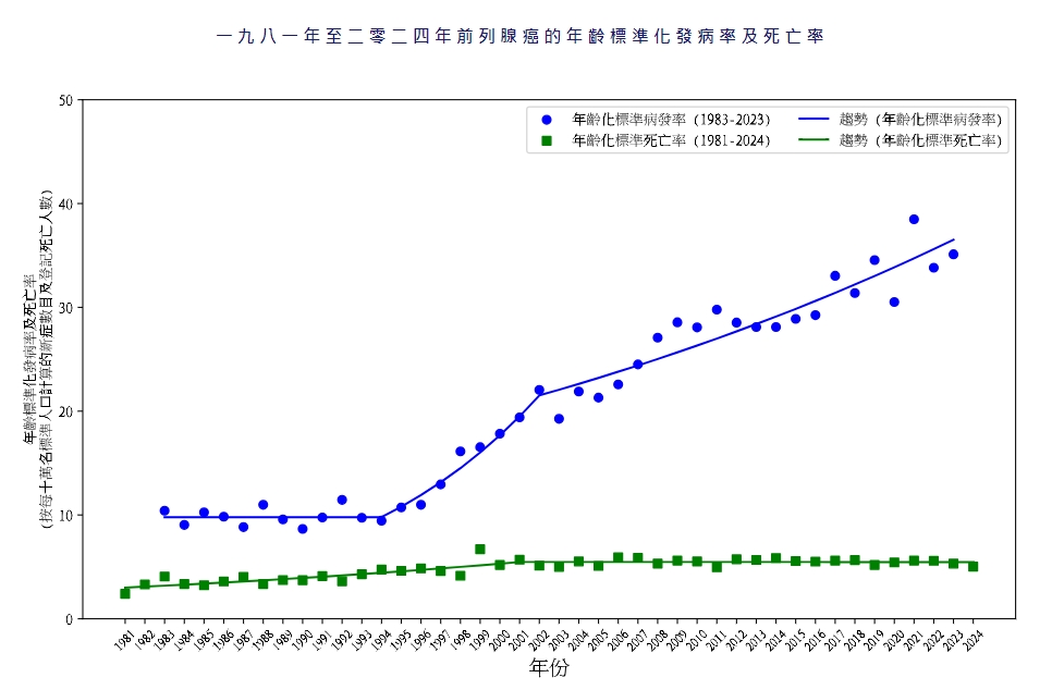 據衞生防護中心統計,前列腺癌在本港男性致命癌症中排第四位。於2024年共有518名男性死於此癌症,佔男性癌症死亡人數的6.0%。按每10萬名男性人口計算的前列腺癌粗死亡率為15.2。而按每10萬名標準人口計算的前列腺癌年齡標準化死亡率則為5.0。