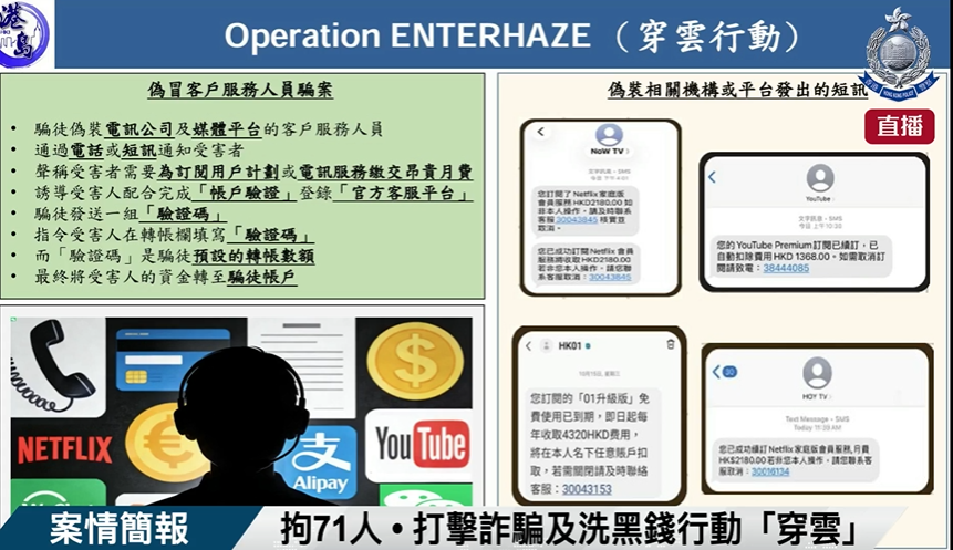 談及騙徒手法,警方指,在「偽冒客戶服務人員騙案」中,騙徒會偽裝成電訊公司及媒體平台等的客戶服務人員,通過電話或短訊通知受害者,聲稱市民已訂閱用戶計劃或收費電訊服務,而需要繳交昂貴月費。事實上,受害市民從未主動登記過任何相關訂閱服務或年費計劃,面對突如其來的「收費通知」,受害人變得緊張,騙徒也因此有機可乘。此時騙徒會以「協助取消誤訂服務、避免持續扣費」為藉口,誘導市民配合完成「賬戶驗證」,要求市民登錄所謂的「官方客服平台」。同時,以「身份核驗、確認賬戶」為由,索取市民個人信用卡信息及銀行賬戶資料。待市民提交完整敏感信息後,騙徒發送一組所謂的「驗證號碼」,指令市民填入平台標註「驗證碼」的輸入欄。市民完成操作後才發現,該輸入欄實為隱藏的轉賬金額欄,所謂「驗證碼」正是騙徒預設的轉賬數額,資金隨即被轉至指定賬戶,同時個人信息也遭洩露。