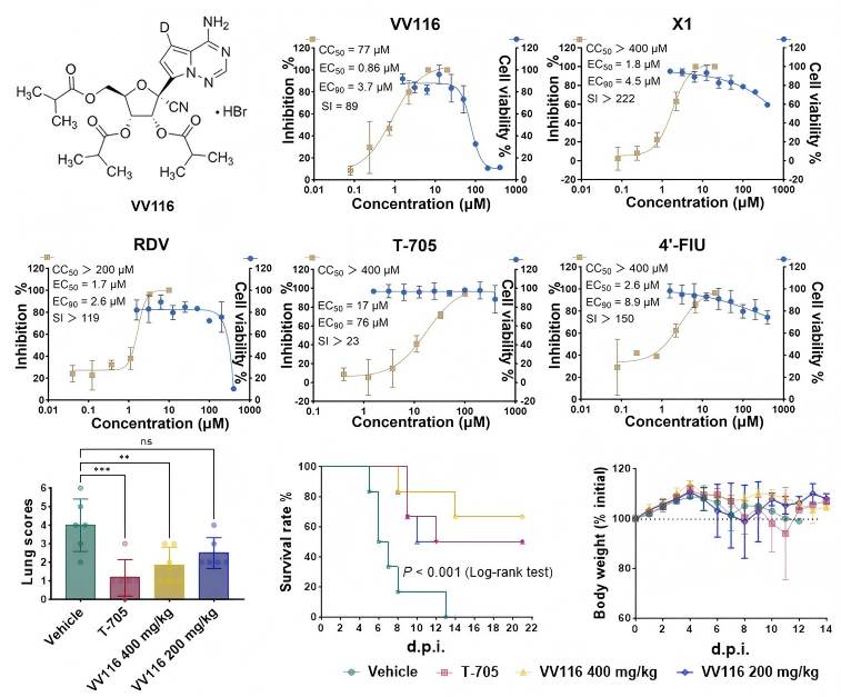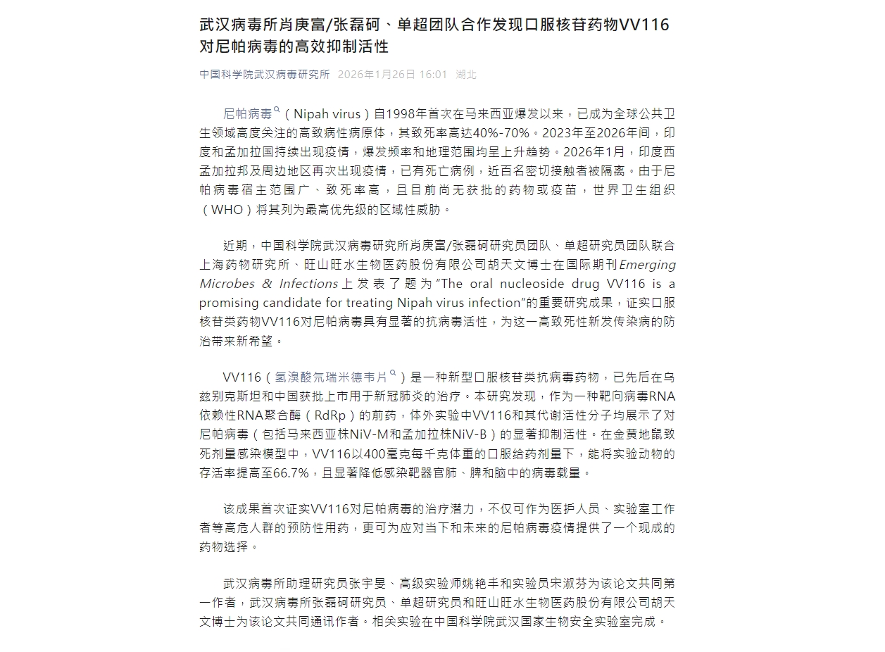 大公文匯全媒體報道,1月26日,中國科學院武漢病毒研究所微信公眾號發文指,近期,中國科學院武漢病毒研究所肖庚富/張磊砢研究員團隊、單超研究員團隊聯合上海藥物研究所、旺山旺水生物醫藥股份有限公司胡天文博士在國際期刊發表的重要研究成果,證實口服核苷類藥物VV116對尼帕病毒具有顯著的抗病毒活性,為這一高致死性新發傳染病的防治帶來新希望。