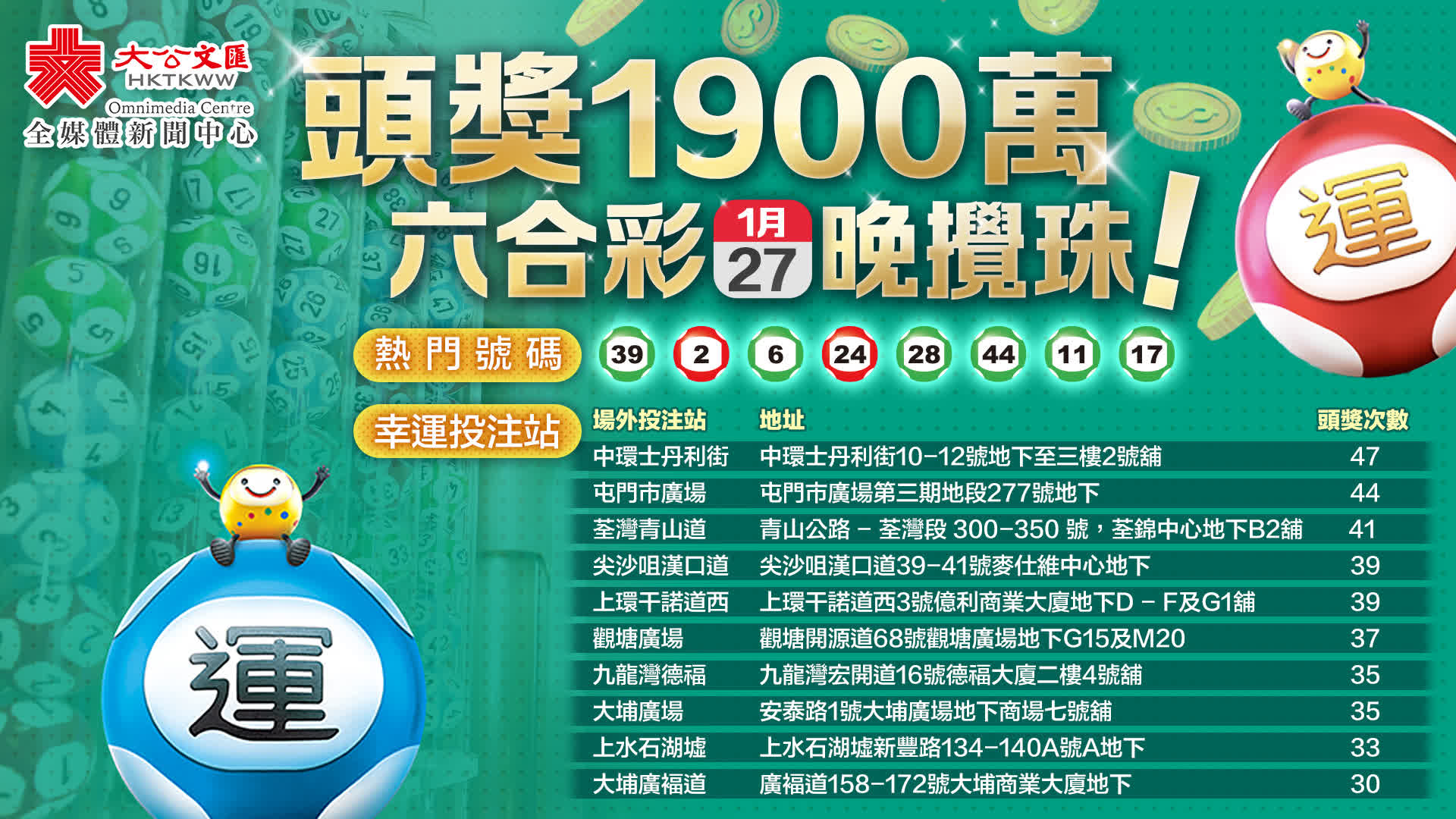 至於10大幸運投注站。截至2025年6月30日,分別為是位於中環士丹利街、屯門市廣場、荃灣青山道、尖沙咀漢口道、上環干諾道西、觀塘廣場、九龍灣德褔、大埔廣場、上水石湖墟、及大埔廣褔道。