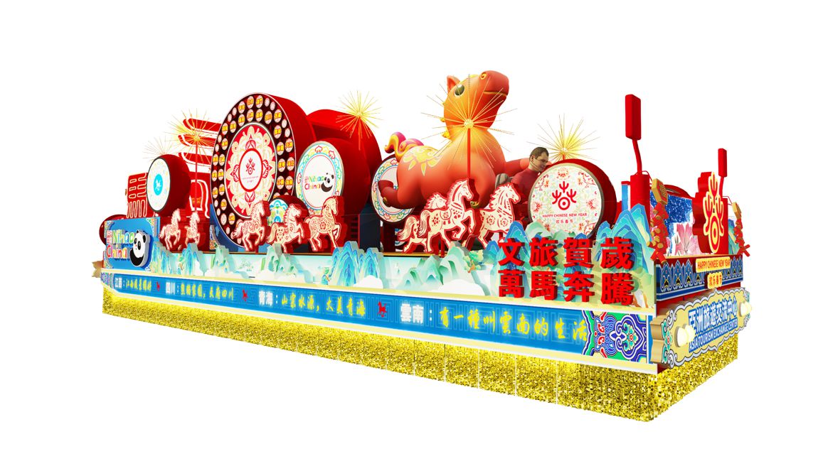 花車以「歡樂春節 萬馬奔騰」為主題,將國家文化和旅遊部「歡樂春節」全球品牌標識及2026年吉祥物「吉祥馬」,與31個省市及港澳地區文旅宣傳形象等融合展現,傳遞鼓動山河、文旅賀歲的時代強音,祝福國家富強、民族振興。