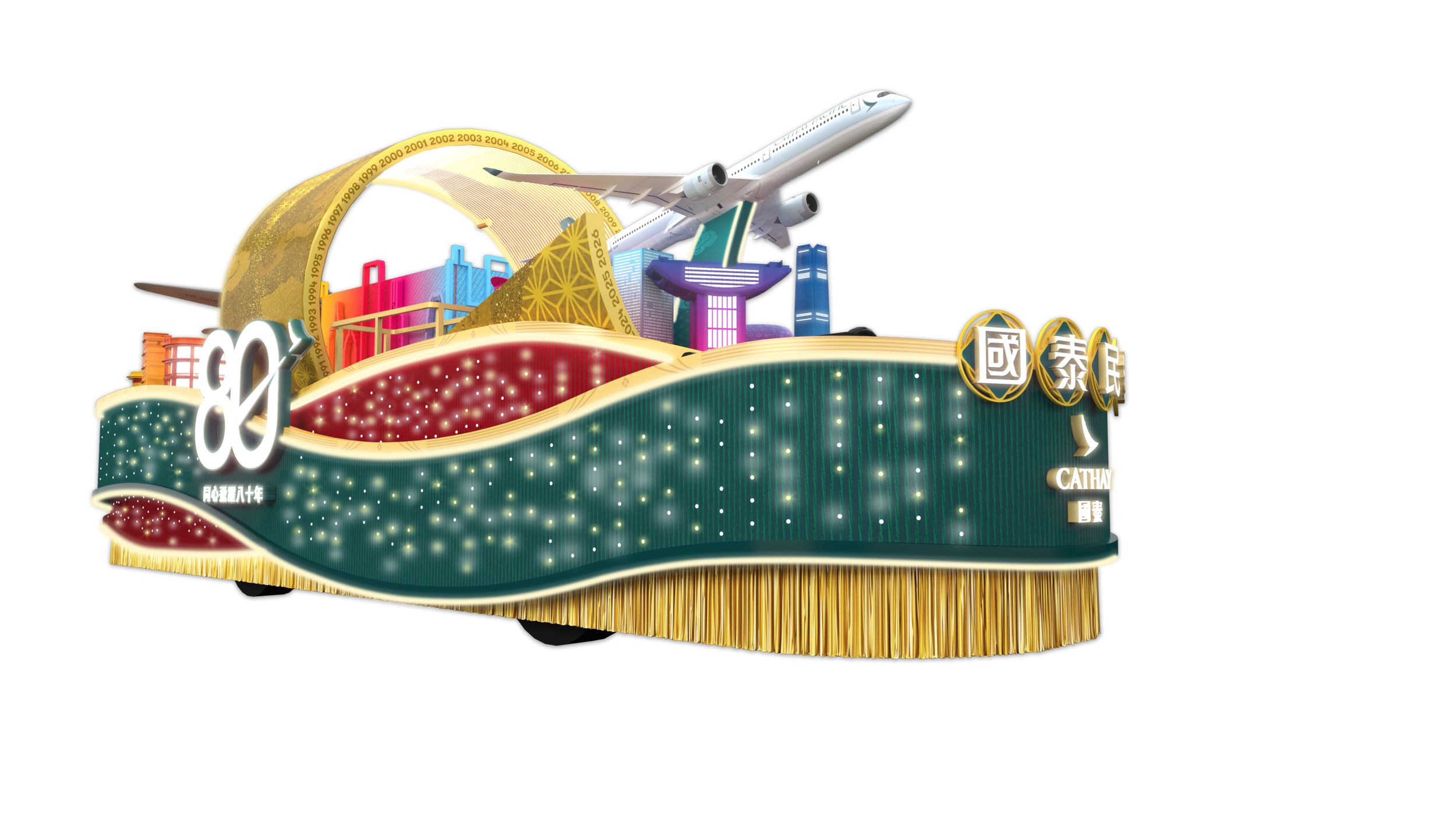 今年國泰花車以慶祝80周年為主題,展示兩款經典客機,穿梭象徵過去與現在的時光隧道,表達國泰一直與香港同行,邁向更好未來。
