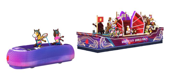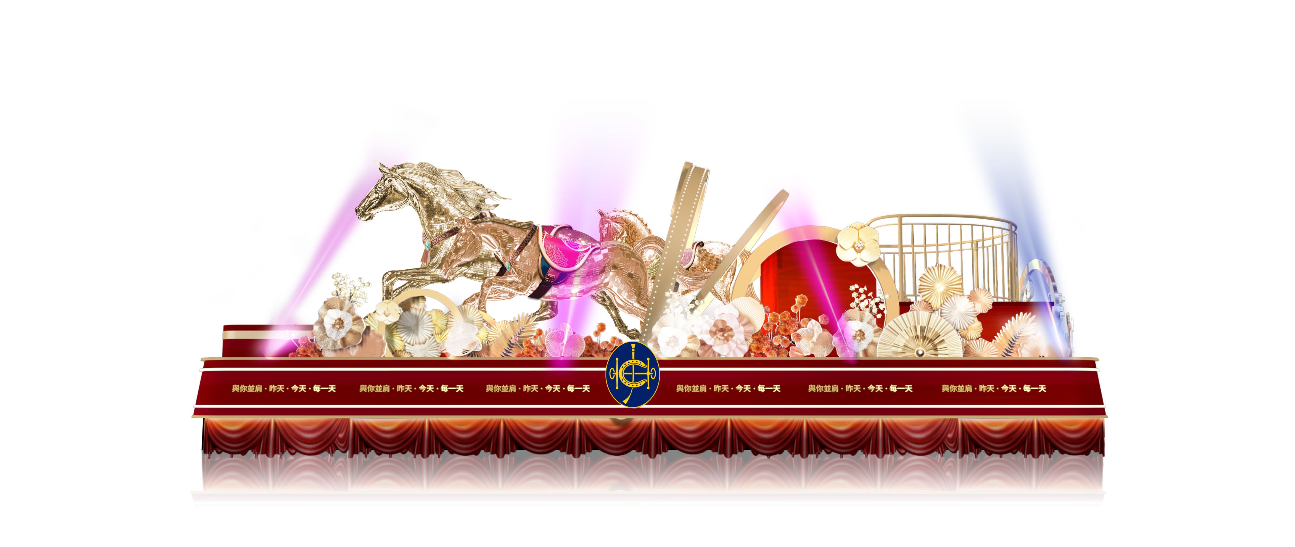 三匹璀璨奪目的駿馬登上花車舞台中央,象徵馬年朝氣蓬勃,映照香港人的無限活力。香港賽馬會期待繼續與大家攜手迎接新一年,不論過去、現在、未來,都與大家並肩前行。
