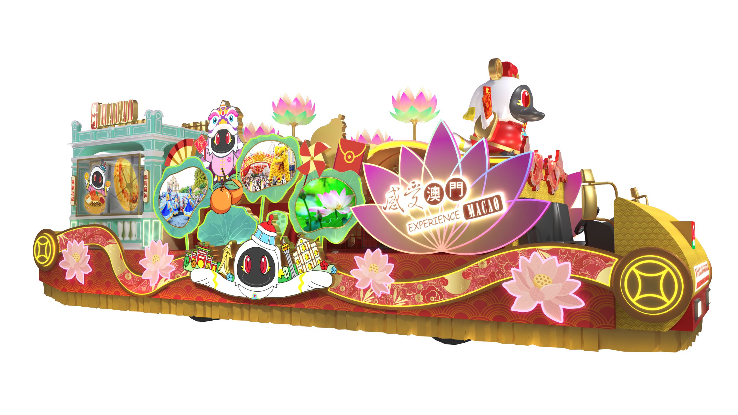花車以「感受澳門」為主題,融合區花荷花與旅遊吉祥物「麥麥」,展現澳門魅力,結合「創意城市美食之都」與「澳門世界遺產」元素。主景為荷花池,由「麥麥」帶領遊歷地標與節慶場景。車尾仿龍環葡韻建築配合投影,呈現澳門風貌。車頭的「財神麥麥」更手持利是,為市民送上新春祝福。