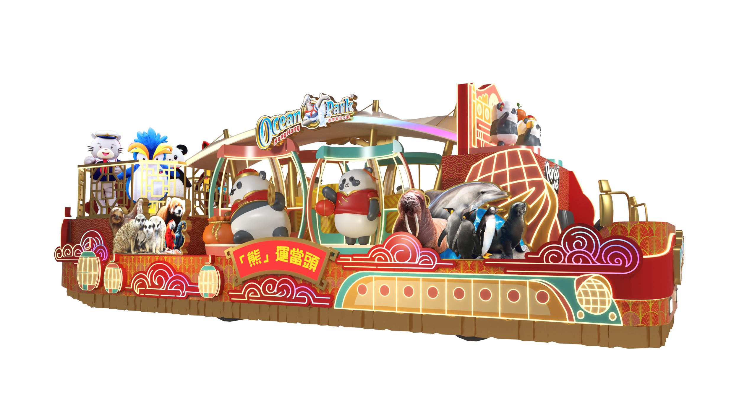 海洋公園大熊貓家族換上新春造型亮相!花車匯集海洋列車、纜車和摩天輪等標誌性元素,盡展海洋公園繽紛多元的魅力,更有「威威與好友」及 可愛動物大使向市民拜年,祝願新年馬到功成!