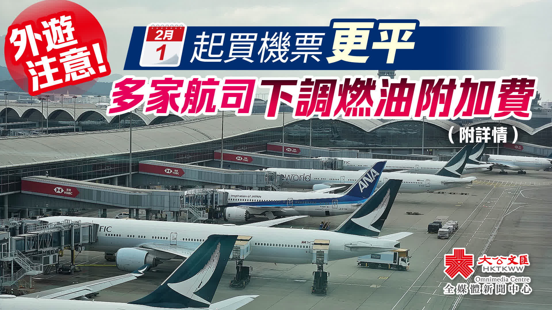 長途航線方面,國泰航空、聯合航空及新西蘭航空亦將下調燃油附加費,由767元減至569元。旅客如在2月1日前購票,仍須支付調整前的費用,因此建議計劃農曆新年期間出遊的市民,可待2月後正式訂票,以節省出行成本。