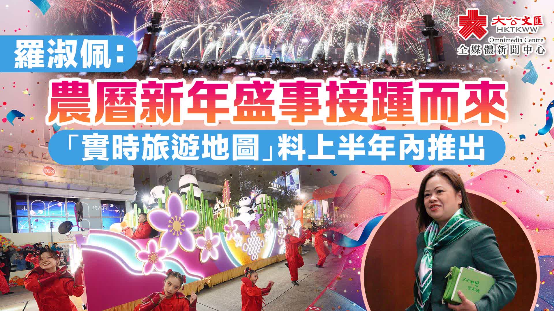 羅淑佩介紹,2026年,旅發局會繼續舉辦以節慶、美食和體育為主題的旗艦盛事,包括香港國際龍舟邀請賽、香港單車節、香港美酒佳餚巡禮、香港繽紛冬日巡禮、香港跨年倒數以及新春國際匯演之夜等,並推陳出新,為旅客打造耳目一新的體驗。今年農曆新年,旅發局會加強向旅客宣傳一系列的精彩活動,包括將於大年初一舉辦的新春國際匯演之夜花車巡遊、年初二的賀歲煙花匯演、年初三的馬年賽馬日及年初五的賀歲盃等。適逢今年是馬年,香港賽馬會將策劃以馬為主題的慶祝活動及表演,推廣賽馬旅遊。