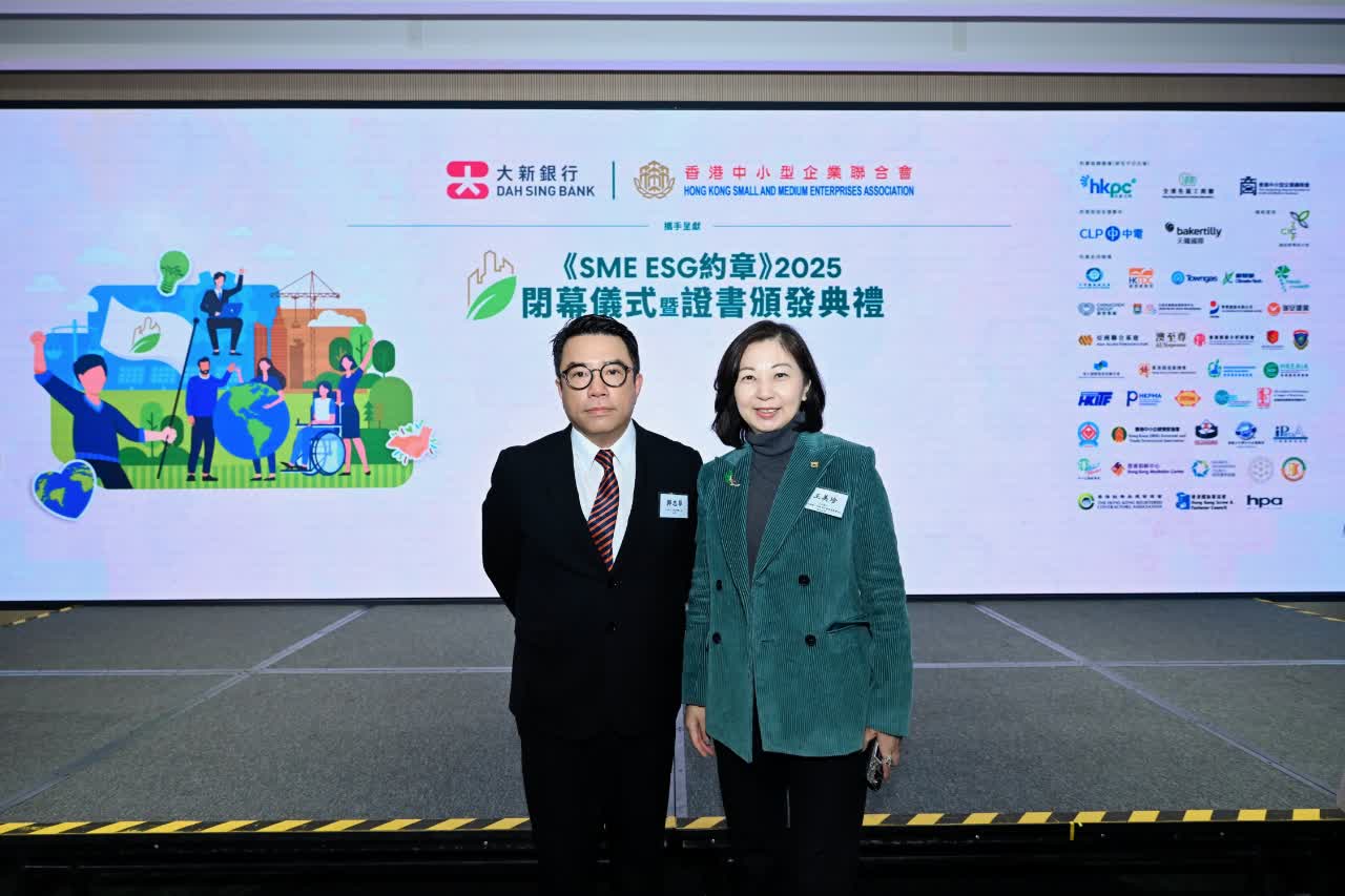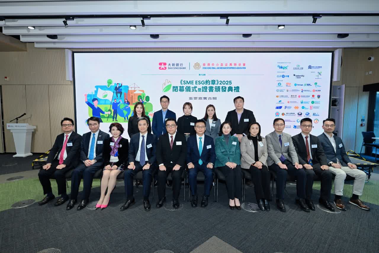 香港中小型企業聯合會(「中小企聯合會」)與大新銀行有限公司(「大新銀行」)去年再度合作,攜手合辦《SME ESG 約章》2025 (「約章」),並首度推出ESG線上自我評估平台,吸引近300家中小企參與及評估自身對環境、社會和管治(ESG)的認識和實踐進程。2025年度共有59家中小企參與「約章」,當中48家成功獲得免費獨立評核及認證,97.4%獲得認證的中小企均認同實踐ESG對中小企業非常重要及重要。