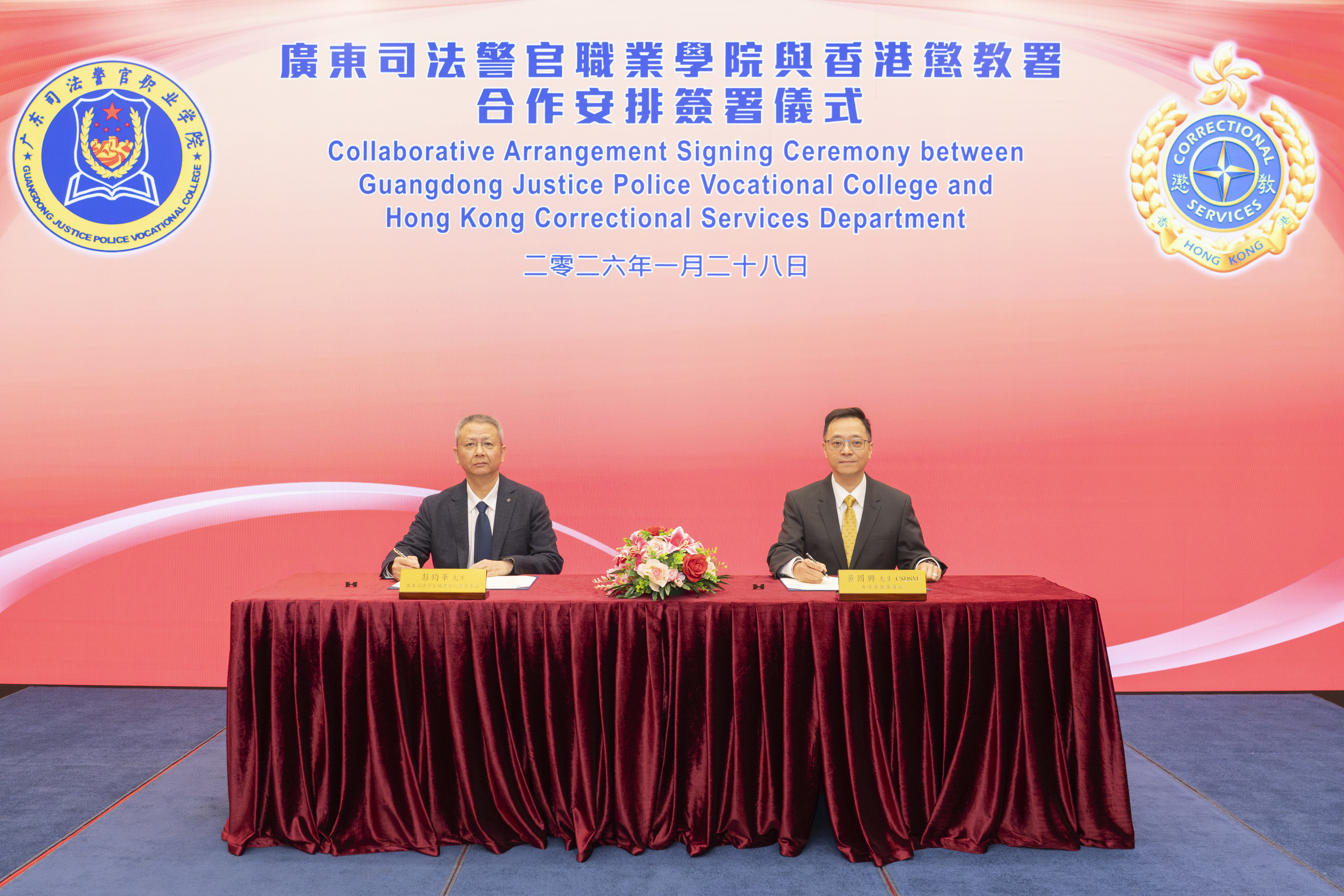 合作安排由懲教署署長黃國興,及廣東司法警官職業學院彭鈞華黨委書記共同簽署。合作項目涵蓋交流互訪、課程培訓、專業研究及專題研討等,有助優化監獄管理及更生服務。展望未來,雙方將透過建立更緊密的恆常合作及交流,發揮協同效應,為懲教專業的發展帶來新動能。
