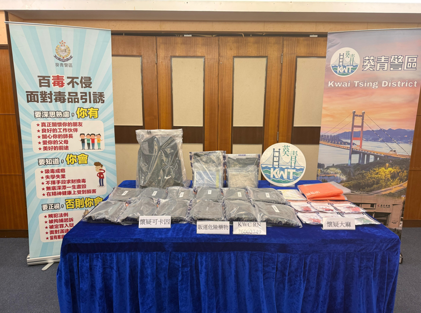 警方表示,經情報搜集及深入調查後,葵青警區特別職務隊於昨日(27日)上午在葵涌展開反毒品行動,並在一個位於葵涌區的公共屋邨單位外,截查一名可疑男子。警方在他手上攜帶的一個環保袋中搜出一磚疑似可卡因。該名男子隨即被警方以「販運危險藥物」罪拘捕。隊員隨即押解該名男子返回其住所進行搜查。隊員進入單位後,發現另一名女住戶,並在單位內其中一個房間的黑色背囊內,檢獲另外13磚疑似可卡因以及6包疑似大麻的毒品。警方隨即將其拘捕。