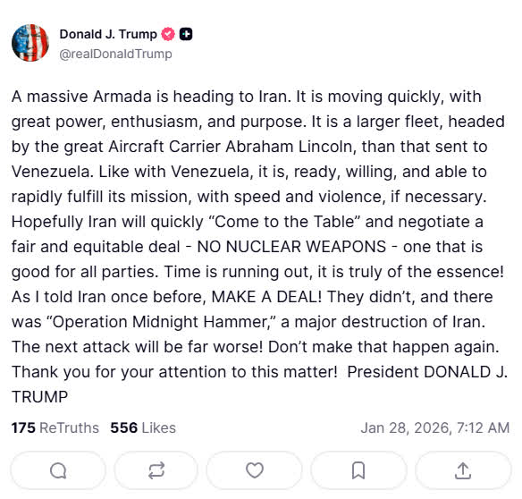 據新華社報道,美國總統特朗普28日在社交媒體上說,一支龐大的艦隊正前往伊朗,已準備好迅速履行其使命。他還稱,希望伊朗能夠迅速坐到談判桌前。