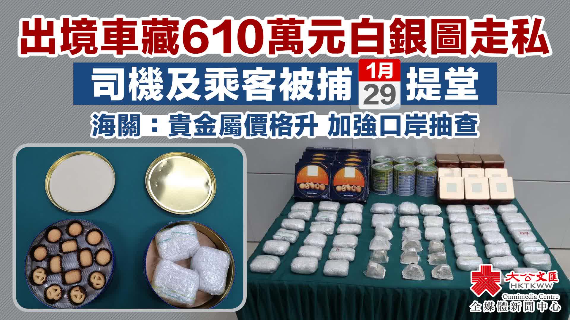 海關昨日根據風險評估,在香園圍邊境管制站截查一輛出境私家車。經查驗後,海關人員發現該批懷疑走私白銀被收藏於車尾箱多個食品鋁罐之中,與其他普通食品混雜擺放。經調查後,海關拘捕一名46歲的懷疑涉案男司機及一名40歲的懷疑涉案男乘客。他們被落案控以一項企圖輸出未列艙單貨物罪,明日在粉嶺裁判法院提堂。海關不排除有更多人被捕。因應貴金屬價格近期上升及新春臨近,海關經已在各口岸加強人手以作抽查。